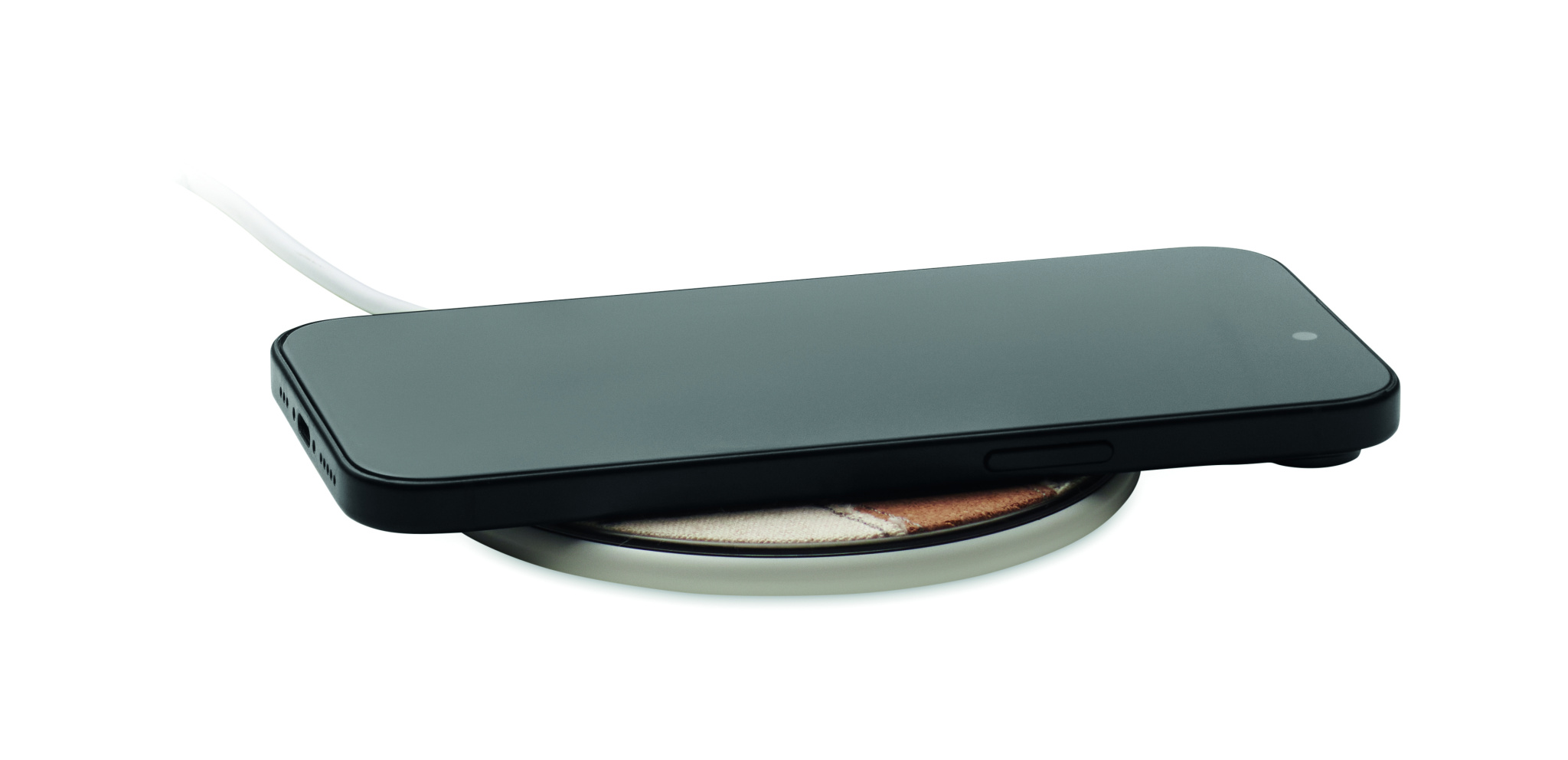 Langaton laturi kierrätetystä ABS-muovista, puuvilla- ja korkkiyksityiskohdilla. Liitä tietokoneeseen, aseta älypuhelin laturille ja anna sen latautua. Lähtöteho: DC 9V/1,67A (15W).