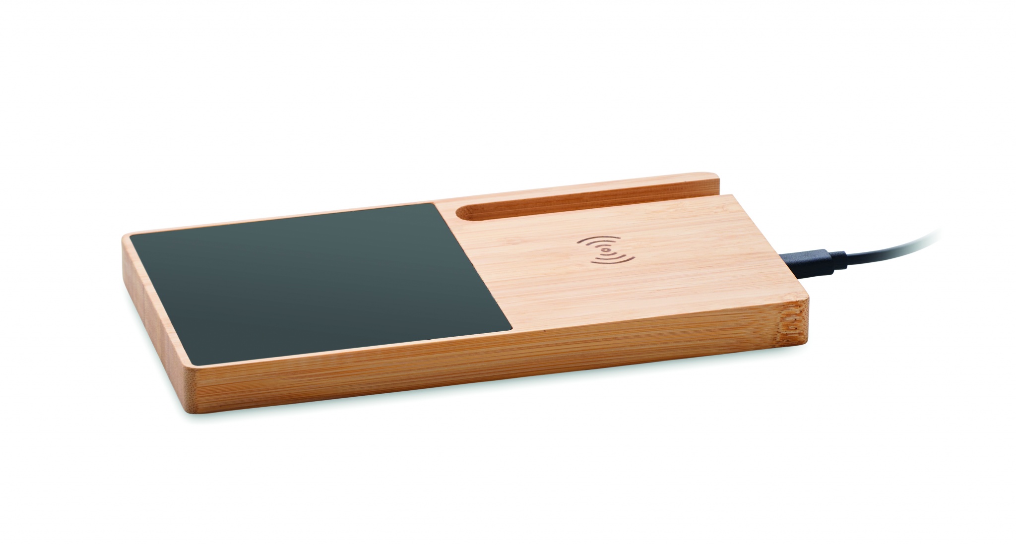 Bambusta tehty langaton laturi , jossa on mukinlämmitin ja puhelinteline. Liitä laite tietokoneeseen, aseta älypuhelin sen päälle ja anna sen latautua. Lähtö: DC 9V/1.67A (15W). Yhteensopiva uusimpien androidien, iPhone® 12, X ja uudempien kanssa.