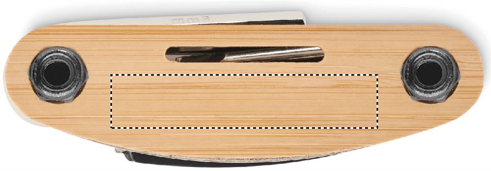 Ruostumattomasta teräksestä valmistettu monitoimityökalu, jossa on bambukuoret. 11 toimintoa. Sisältää: kuusiokoloavaimet, litteä jakoavain , hylsyn jatke, Phillips-ruuvimeisseli ja hylsyavain.