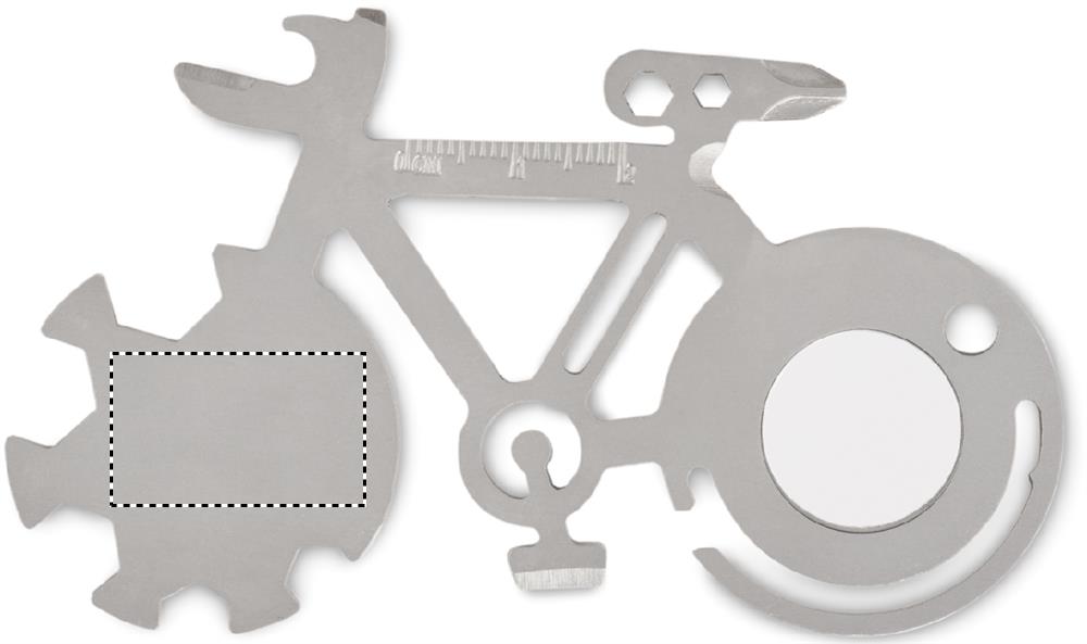 Monitoimityökalu 11-in-1. Polkupyörän muotoinen, ruostumattomasta teräksestä valmistettu työkalu jossa on mm. pullonavaaja, veitsi, viivain ja ruuvimeisselit.