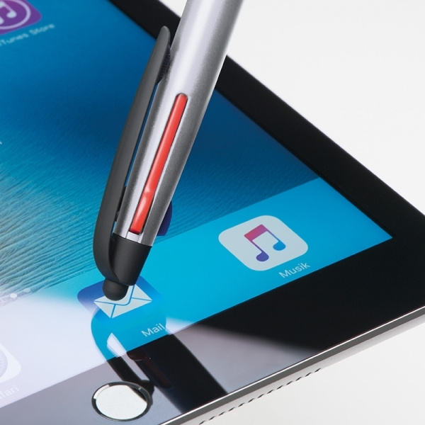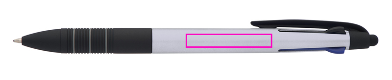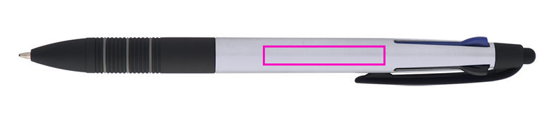 4in1 muovinen kuulakynä, jossa 3 eri kirjoitusväriä (sininen, punainen ja musta) + kosketustoiminto ja kumitettu otealue. Painamme logosi varrelle.