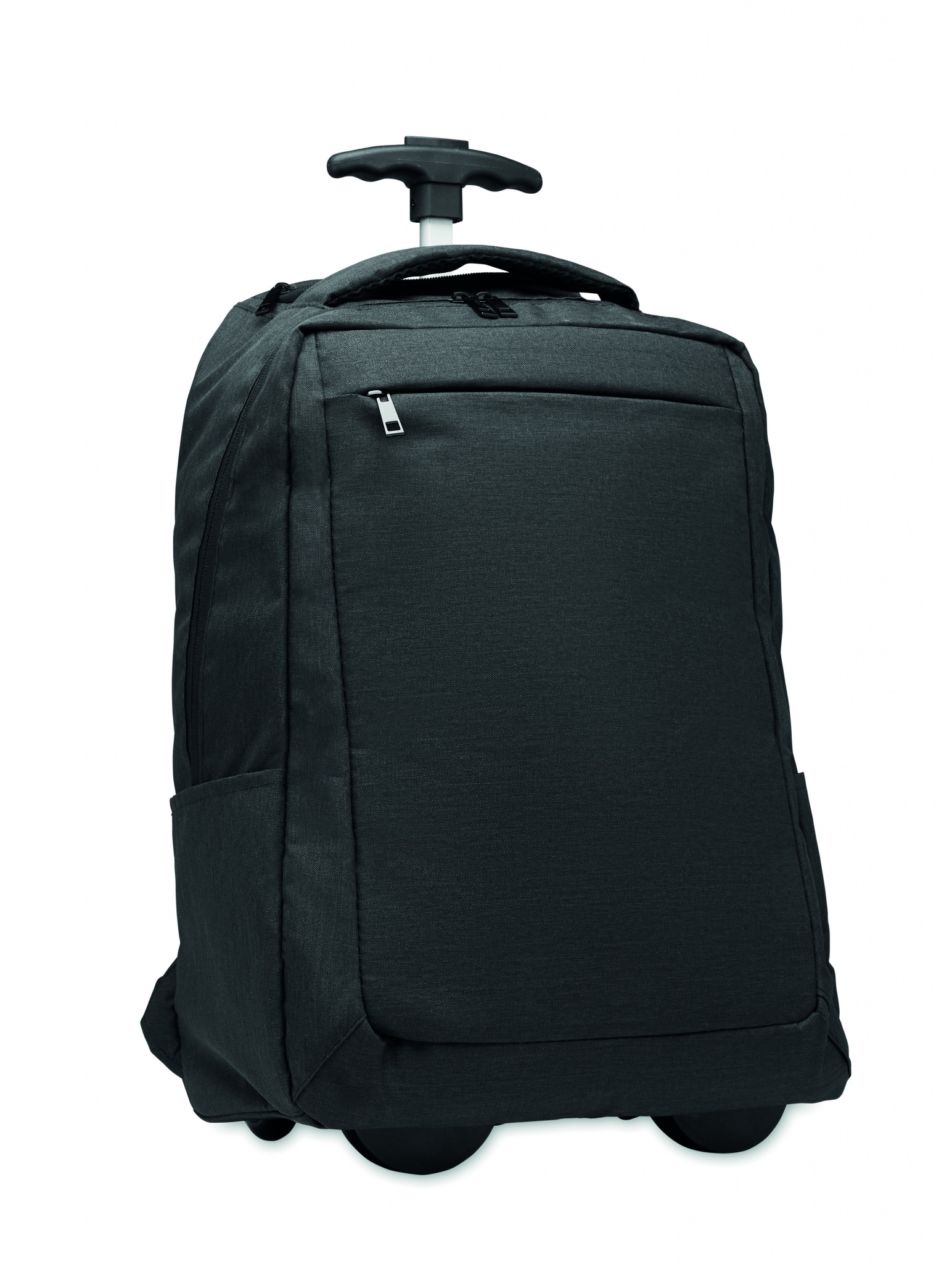 Pyörillä varustettu kannettava reppu 600D RPET-polyesteriä. Sisältää lokeron 15 tuuman kannettavalle tietokoneelle. Vetoketjullinen etutasku. Kaksi sivutaskua. Kolme sisäistä liukutaskua. Pehmustetut selkä- ja olkahihnat. 2 pyörää ja kaksinkertainen putkirunko.