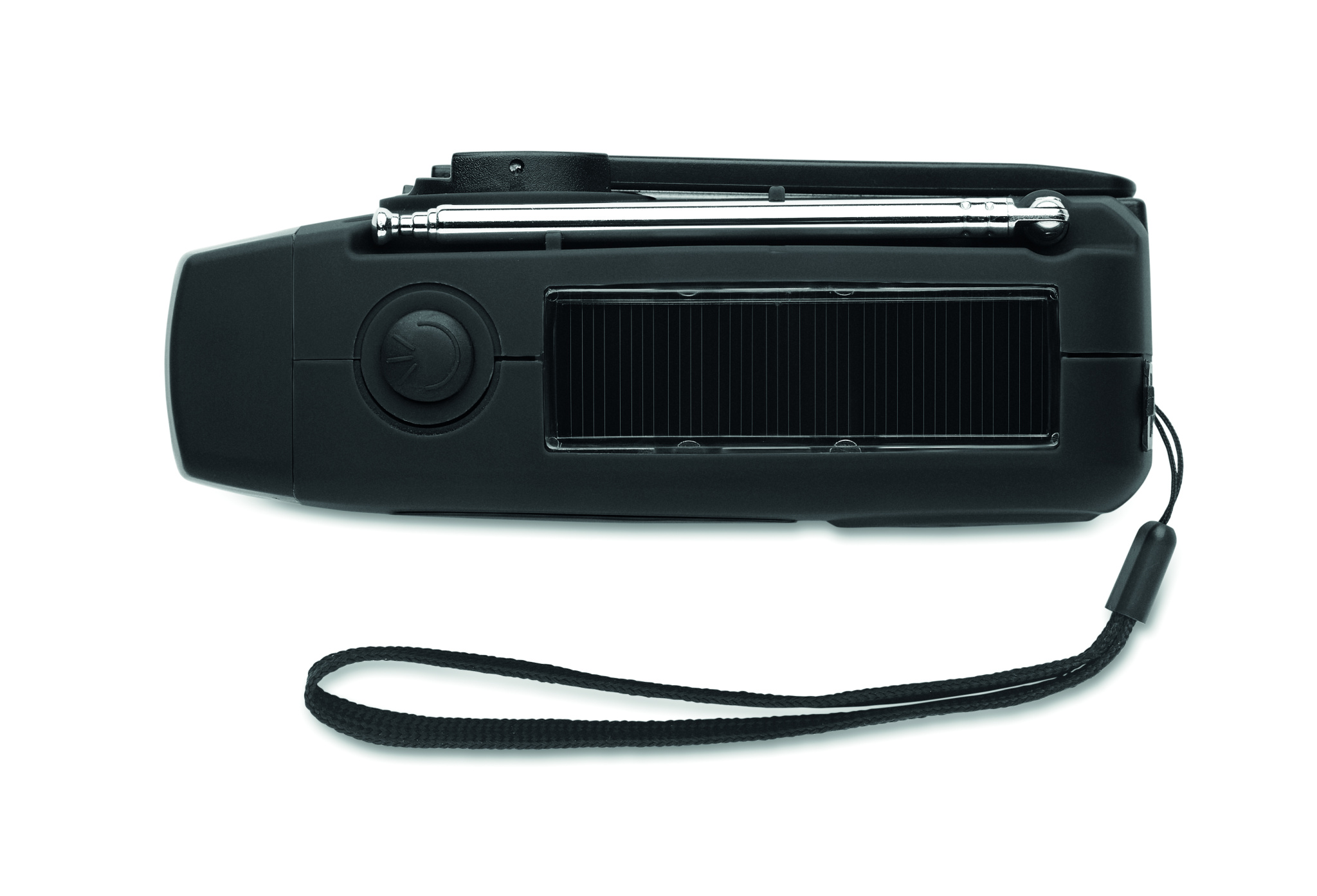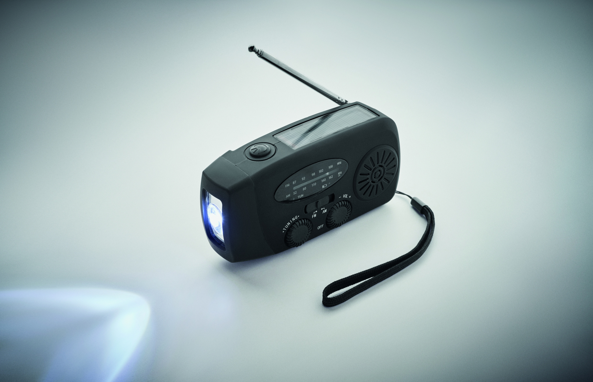 Kannettava AM/FM-radio ABS-muovista, LED-taskulampulla (2 asetusta) ja 1200 mAh:n varavirtalähteellä hätälatausta varten. Virtalähteenä aurinkokenno ja käsikamme.