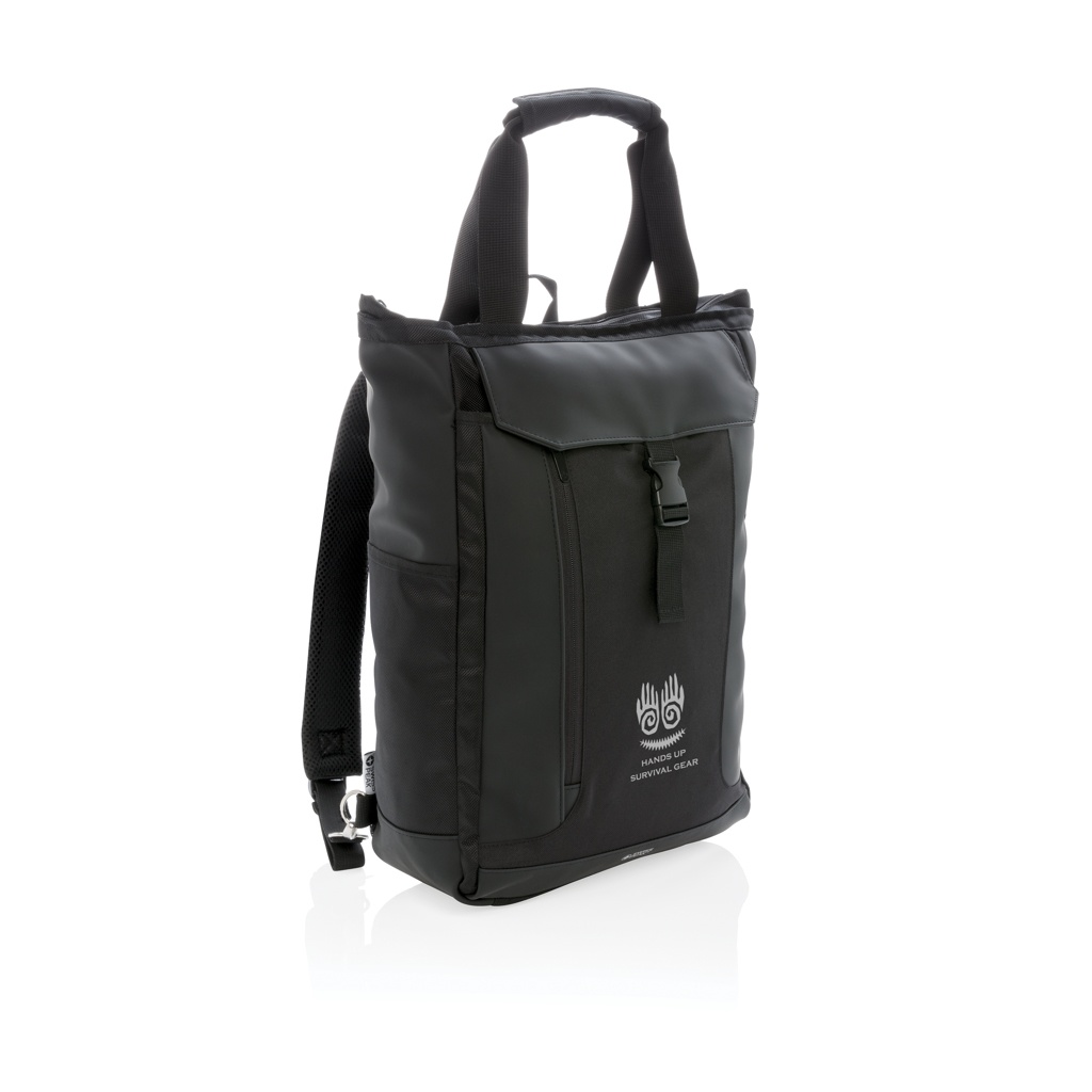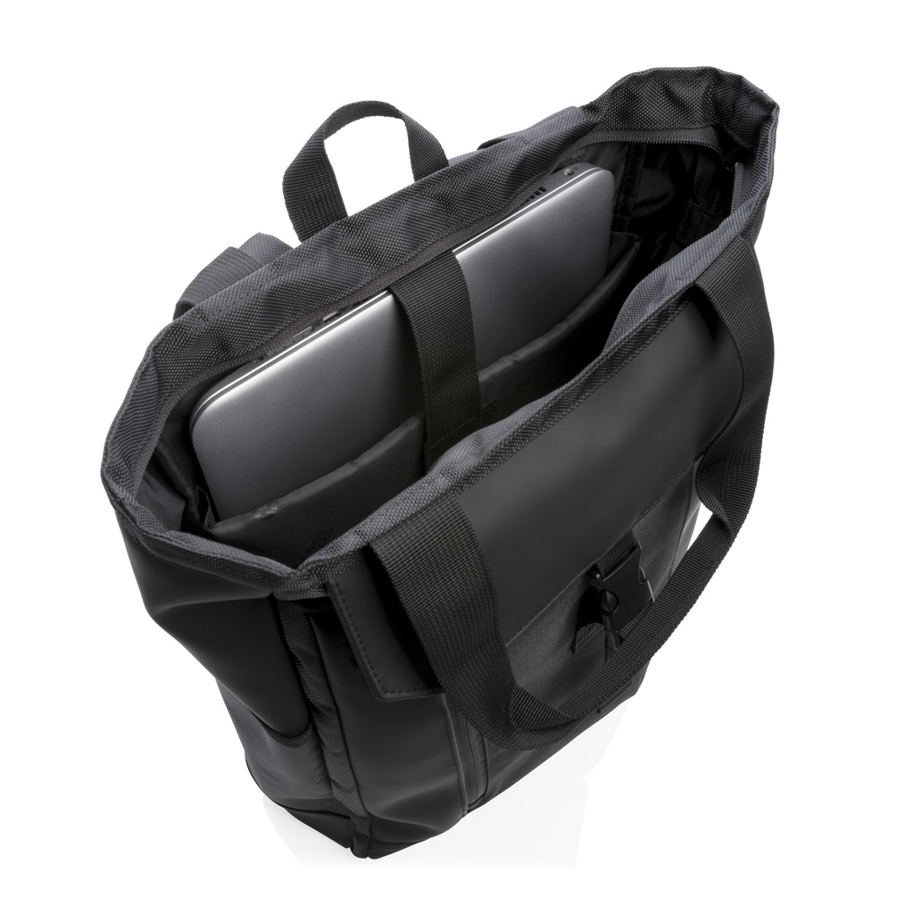 Tätä monipuolista laukkua voidaan kantaa olalla, kädessä tai reppuna. Sisältää pehmustetun lokeron 15 tuuman latopille ja RFID-suojatut kotelot. Ei sisällä PVC:tä.