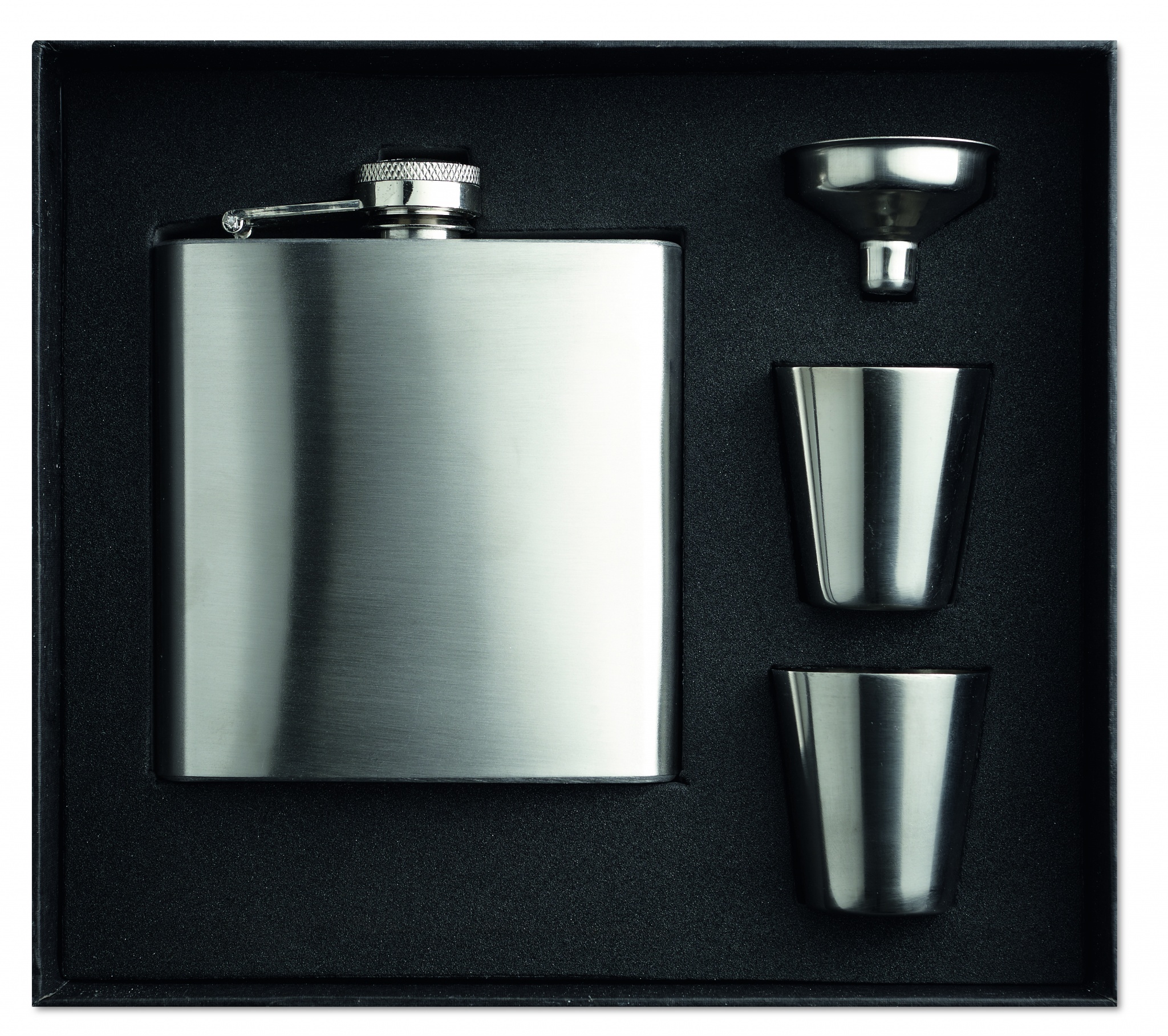 Yksiseinäinen 175 ml taskumatti, sisältää kaksi shottilasia ja suppilon, helpottaakseen juoman annostelun taskumattiin. Pakattuna mustaan lahjapakkaukseen.