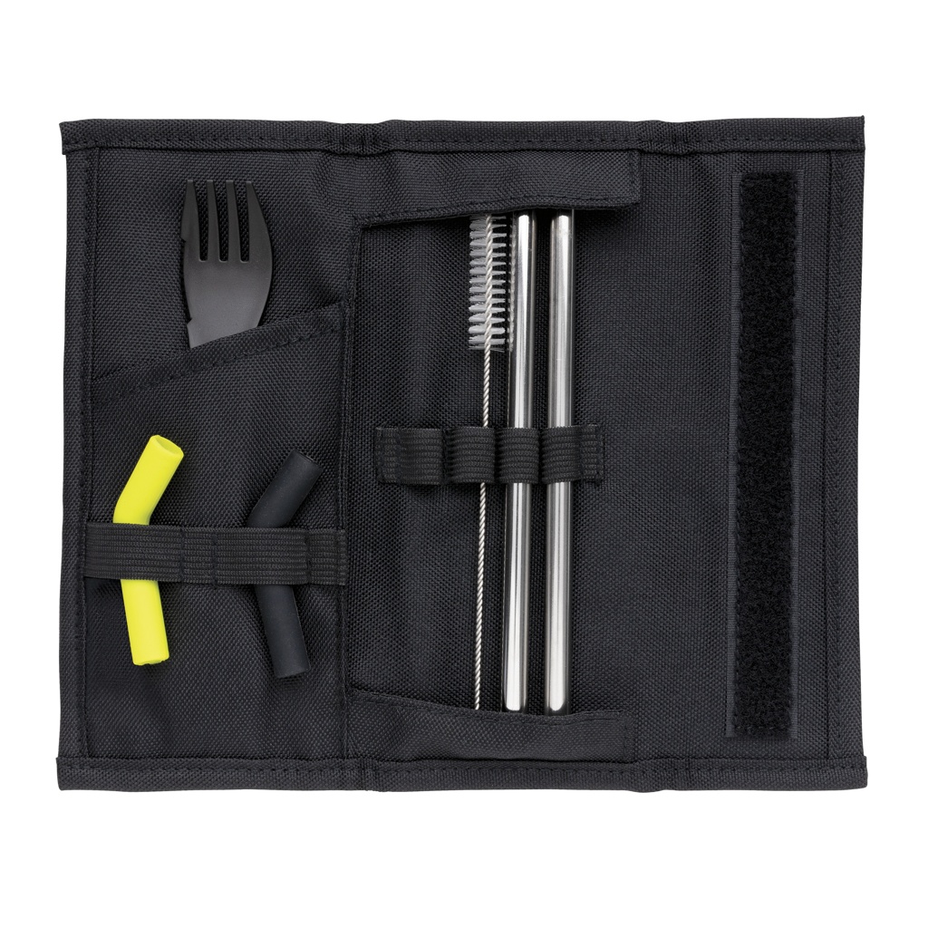 Tierra kaksiosainen pilli- ja aterinpidike on ihanteellinen mukanapidettävä setti, jos haluat vähentää kertakäyttöisten muovien käyttöä. Tämä setti sisältää kaksi ruostumattomasta teräksestä valmistettua pilliä, puhdistusharjan, sporkin, ja kaksi taitettua silikonipilliosaa, jotka voidaan yhdistää suoraan pilliosaan (ruostumatonta terästä). Näin juomamukavuus on huipussaan. Tuotteen kaksi eri väriä helpottavat osien toisistaan erottamisessa. Pakattu käytännölliseen pussukkaan Velcro-sulkijalla. Voidaan pestä tiskikoneessa. Ulkopuoli 100% 600D polyesteria, sisäpuoli 100% 210D polyesteria. PVC vapaa.