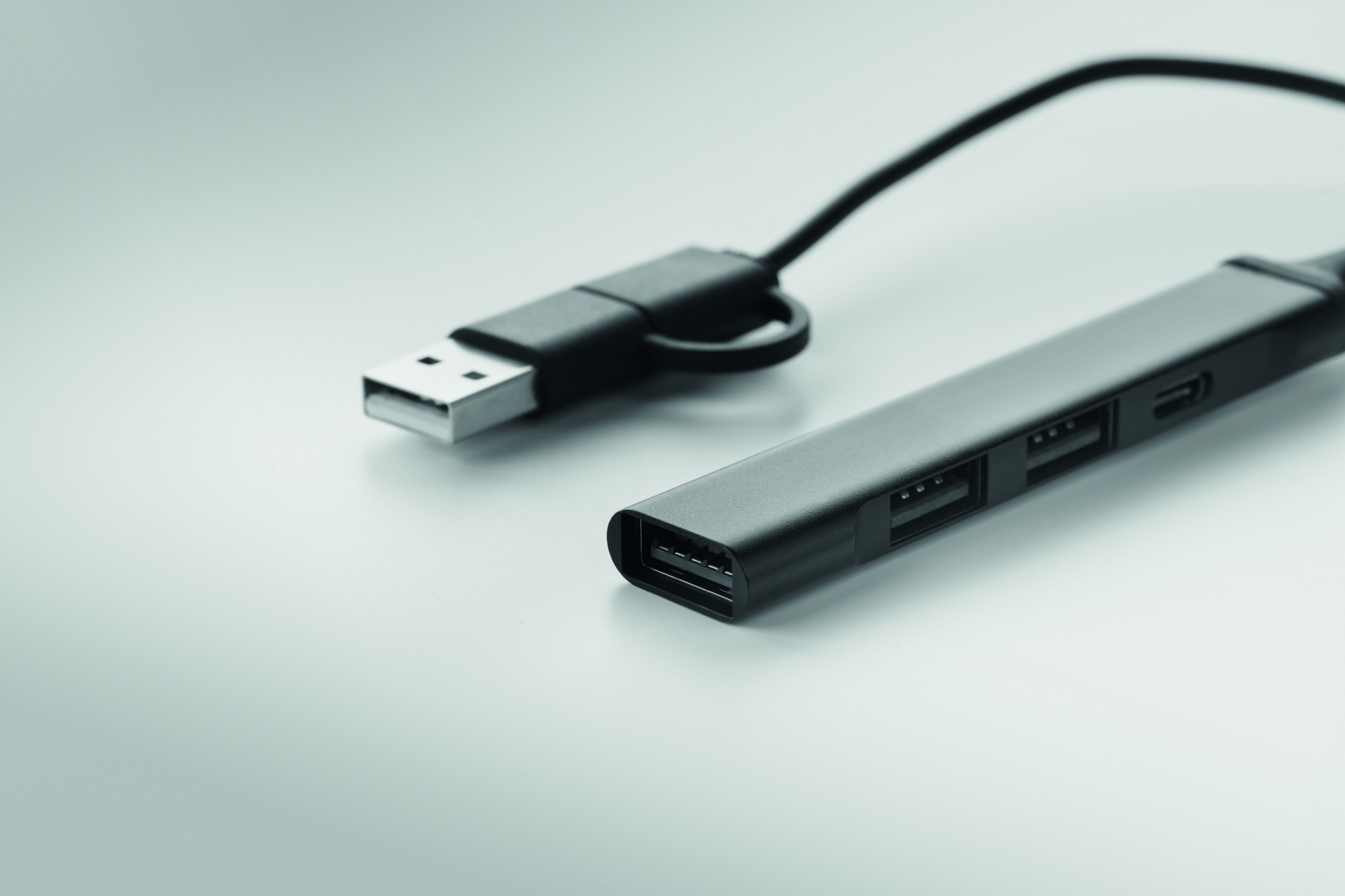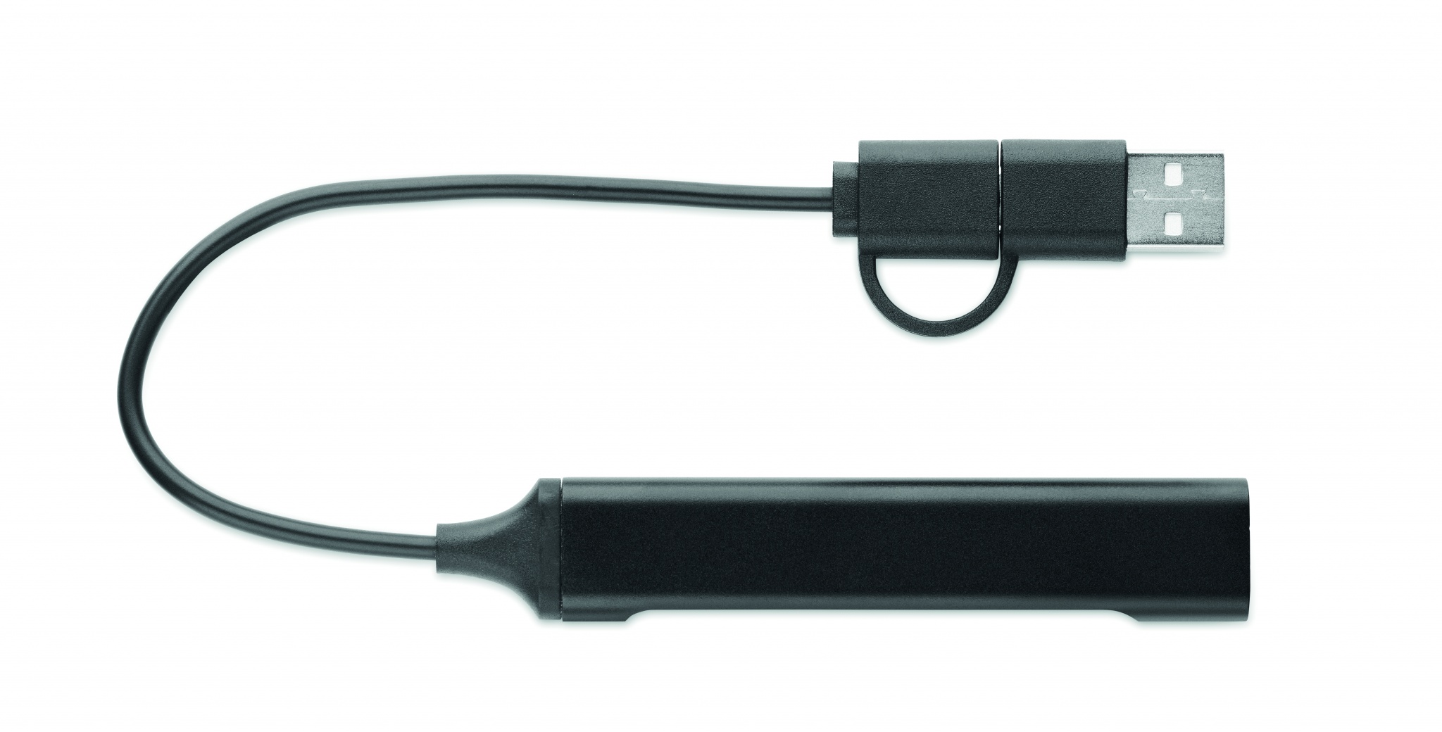 4-porttinen USB-keskitin kierrätettyä alumiinia. 3 USB-A + 1 Type-C. Tulo: 2-in-1 Type-C & Type-A. Kaapelin pituus: 19 cm.
