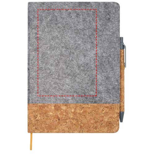 Kovakantinen A5-muistikirja on valmistettu korkista ja kierrätyshuovasta, ja siinä on 80 viivoitettua arkkia 70 g/m²:n paperia, kuminauhasuljin, nauhamerkki ja kynälenkki. Kuulakärkikynän painike, klipsi ja kärki on valmistettu kierrätysmuovista ja runko korkista. Kynän muste: Musta. Kirjoituspituus: 600 metriä. Kirjoitusjäljen paksuus: 1,0 mm.