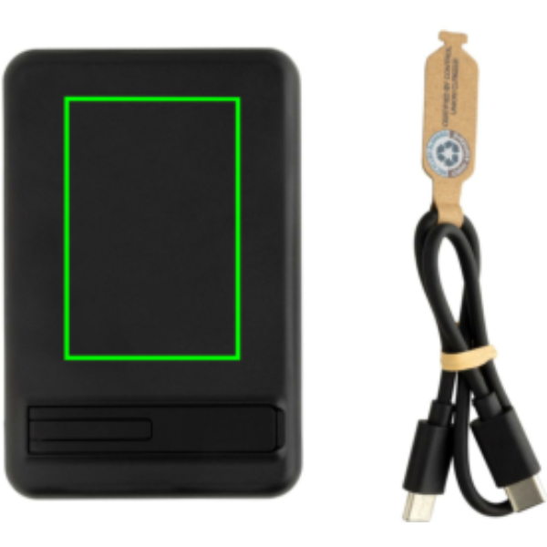 5.000 mAh:n taskukokoinen tehopankki, jossa on 5W:n magneettinen langaton laturi, jonka kotelo on valmistettu RCS-sertifioidusta kierrätetystä ABS-muovista ja FSC-sertifioidusta bambusta... RCS (Recycled Claim Standard) on standardi, jonka avulla tuotteen kierrätyspitoisuus voidaan todentaa koko toimitusketjun ajan. Kokonaiskierrätyspitoisuus: 22 % tuotteen kokonaispainosta. Virtalähde sisältää pitkäkestoisen A-luokan 5 000 mAh:n litiumpolymeeriakun. Integroidulla puhelintelineellä. Virran merkkivalot ilmoittavat jäljellä olevan energiatason, joten tiedät aina, milloin lataus on suoritettava uudelleen.; C-tyypin tulo 5V/2.4A; C-tyypin lähtö: 5V/2A.4A Tuote ja tarvikkeet PVC-vapaita. Mukana RCS-sertifioitu kierrätetty TPE-latauskaapeli. Pakattu FSC® mix -pakkaukseen.