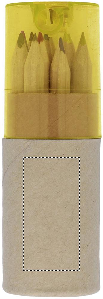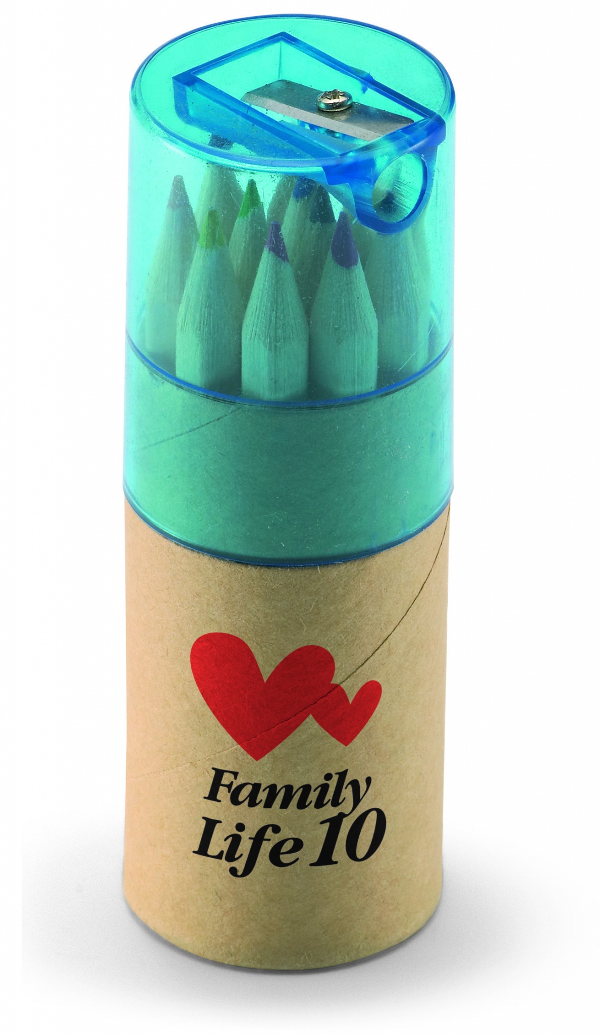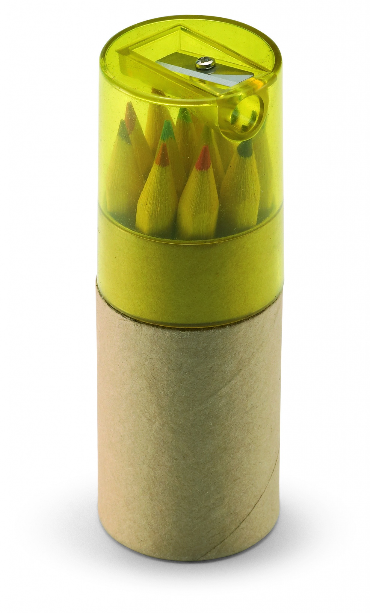 12 vienetų dažymo pieštukai tūbelėje. Pieštukų drožtukas permatomas dangtelis.