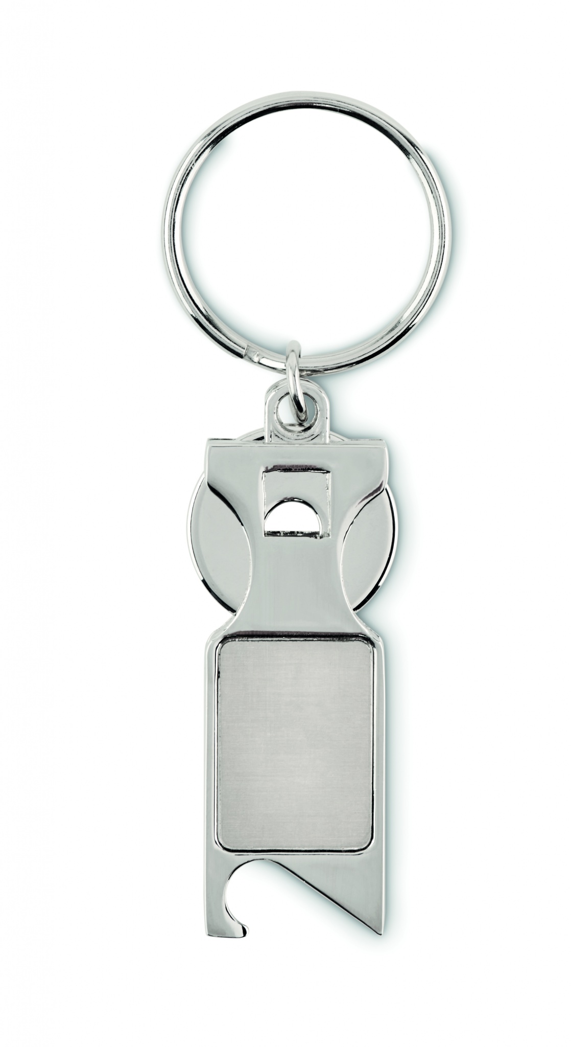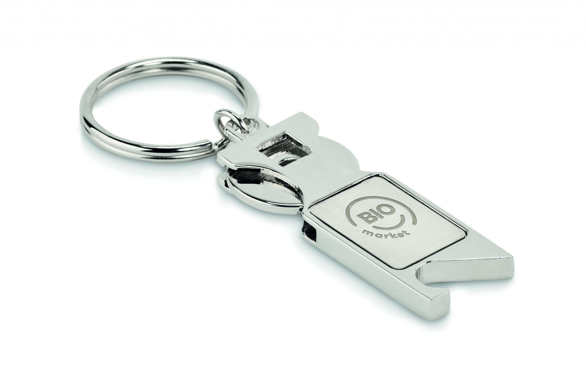 Cinko lydinio raktų pakabukas su euro žetonu ir butelių atidarytuvu.