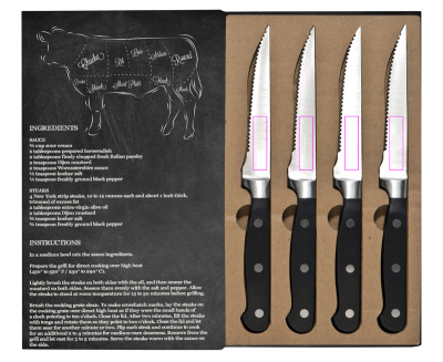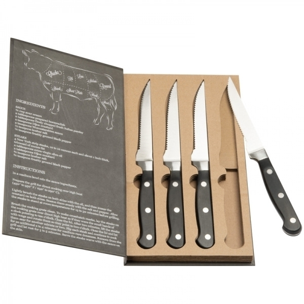 Istorija apie mėsą! Tobulam kepsniui reikia tobulų peilių, kitaip jūsų kepsnys atrodys daugiau ar mažiau kaip maltas. Šis kepsnių peilių rinkinys pagamintas iš nerūdijančio plieno, o kokybė yra tiesiog nuostabi. Įpakavimas padarys rinkinį dar geresnį. Ant pakuotės atspausdinsime Jūsų logotipą.