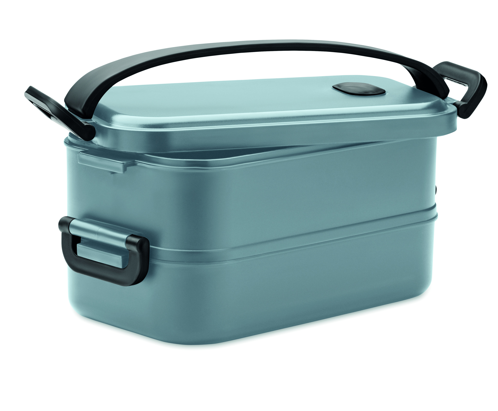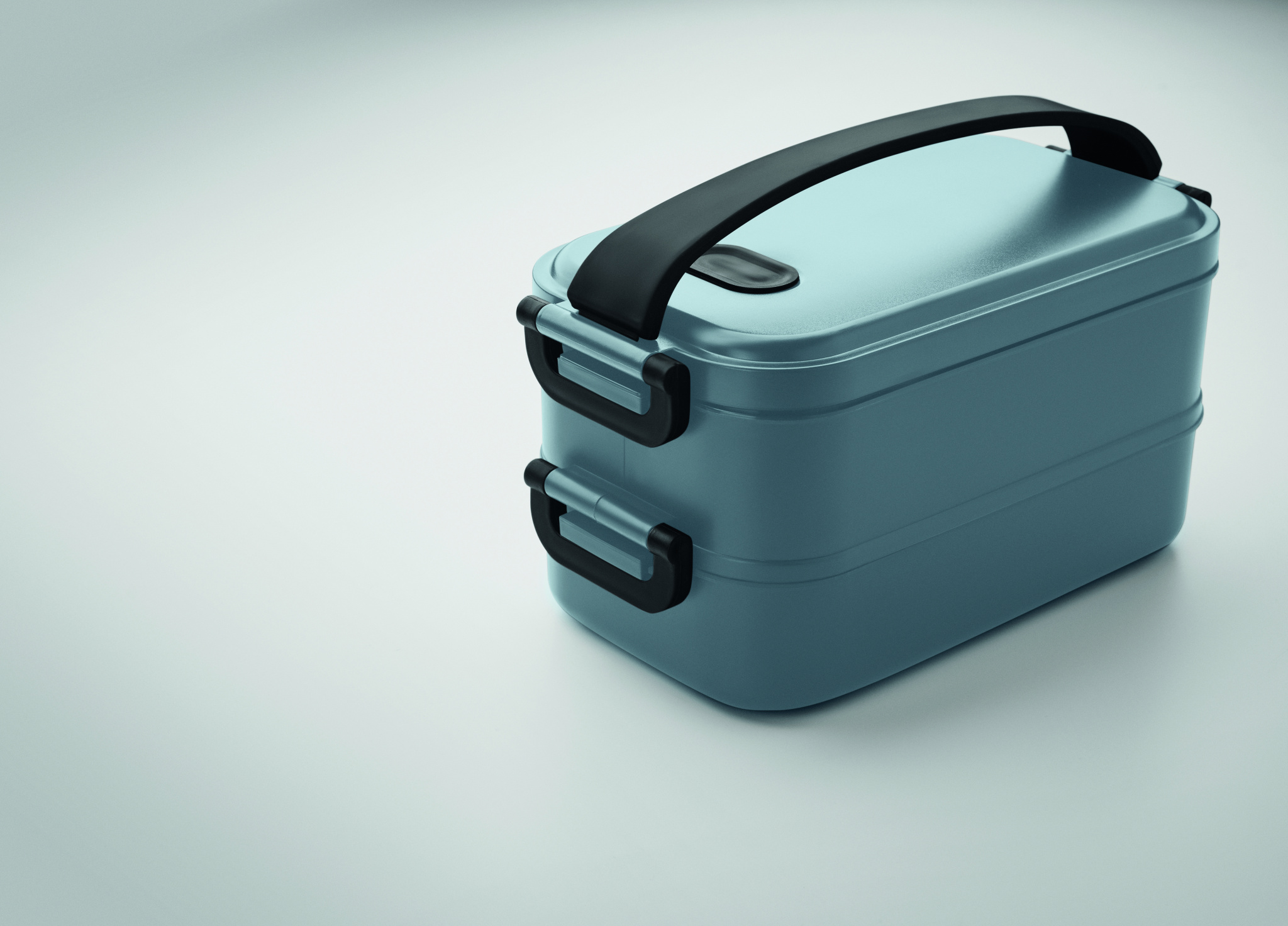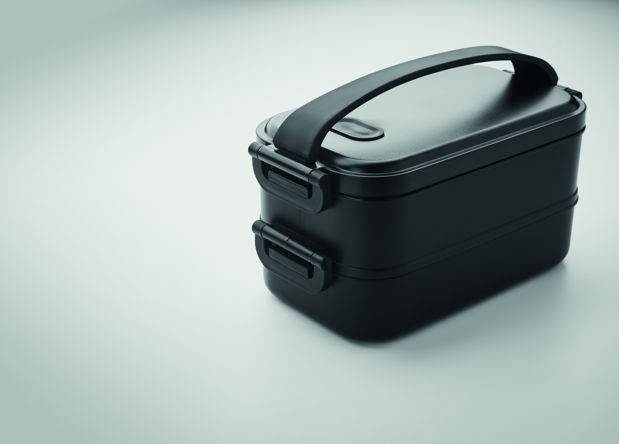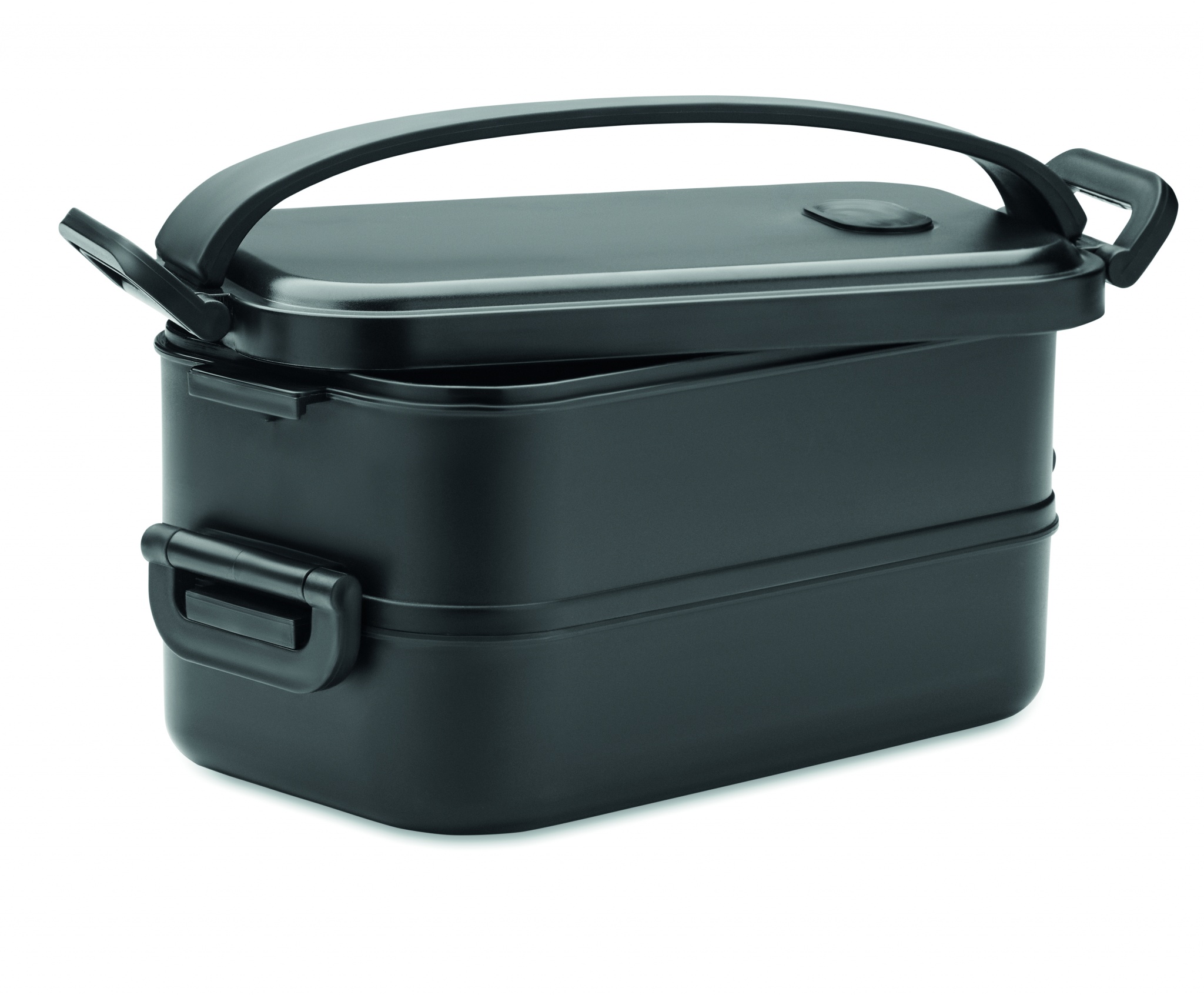 Perdirbta PP dviejų pakopų priešpiečių dėžutė su nuimamu skirstytuvu su šoninėmis sagtimis ir sandariu dangteliu. Talpa: 800 ml (2x).