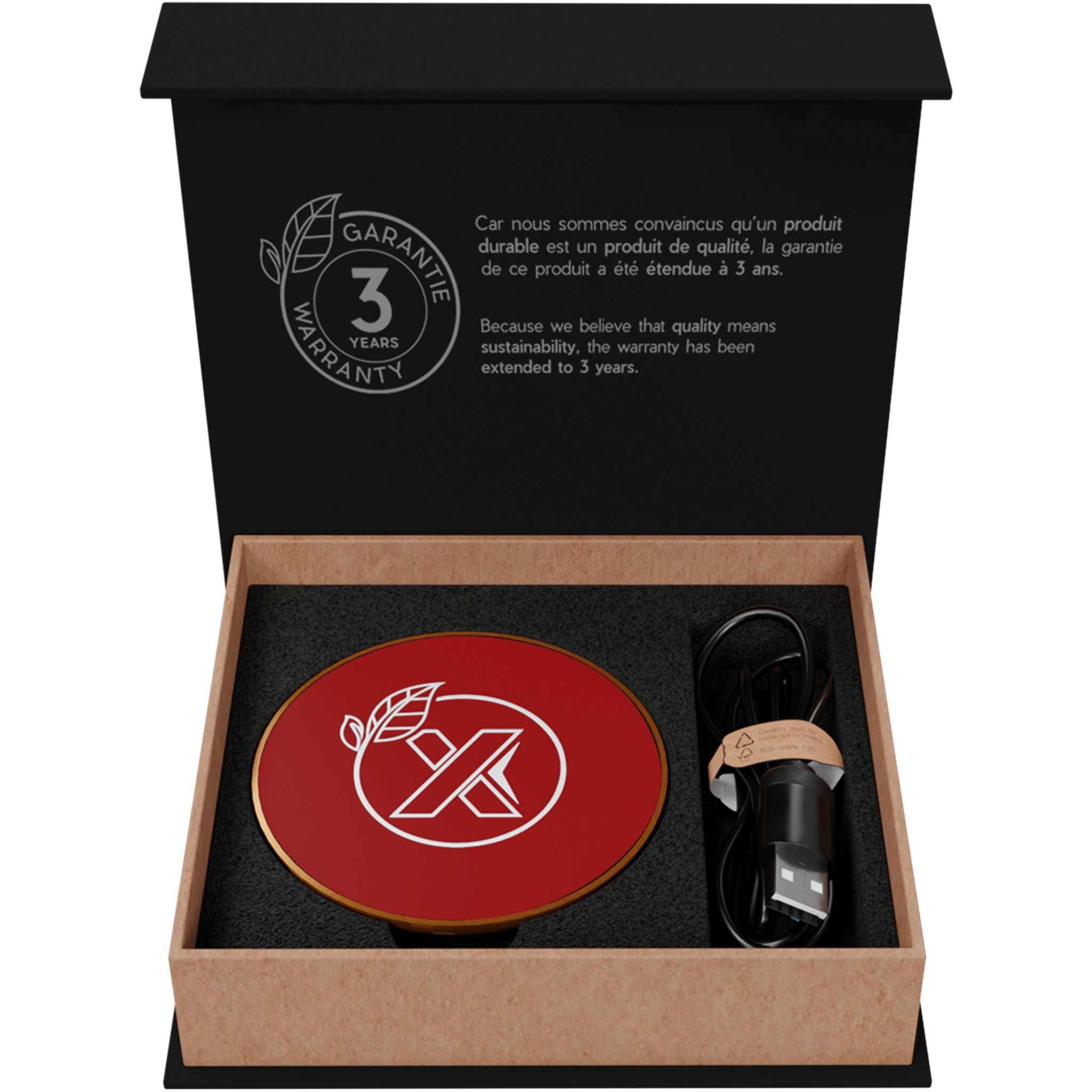10W belaidžio įkrovimo stotelė iš gumos ir medžio bei įkrovimo laidas iš perdirbto PET plastiko. Galima papuošti šviečiančiu logotipu. Pristatoma juodoje kraft dovanų dėžutėje iš perdirbto popieriaus su magnetiniu uždarymo mechanizmu. Patentas EUROPE EUIPO.