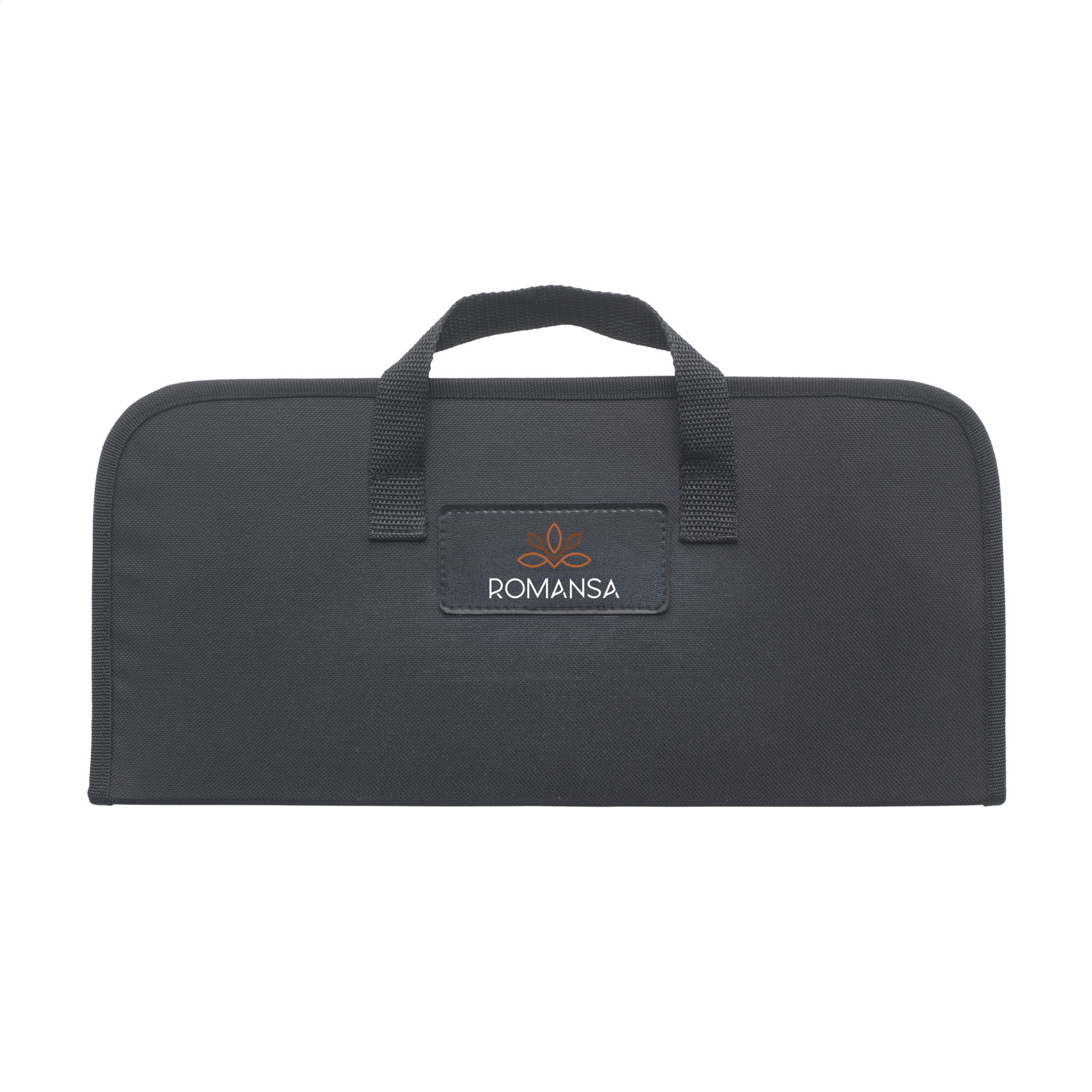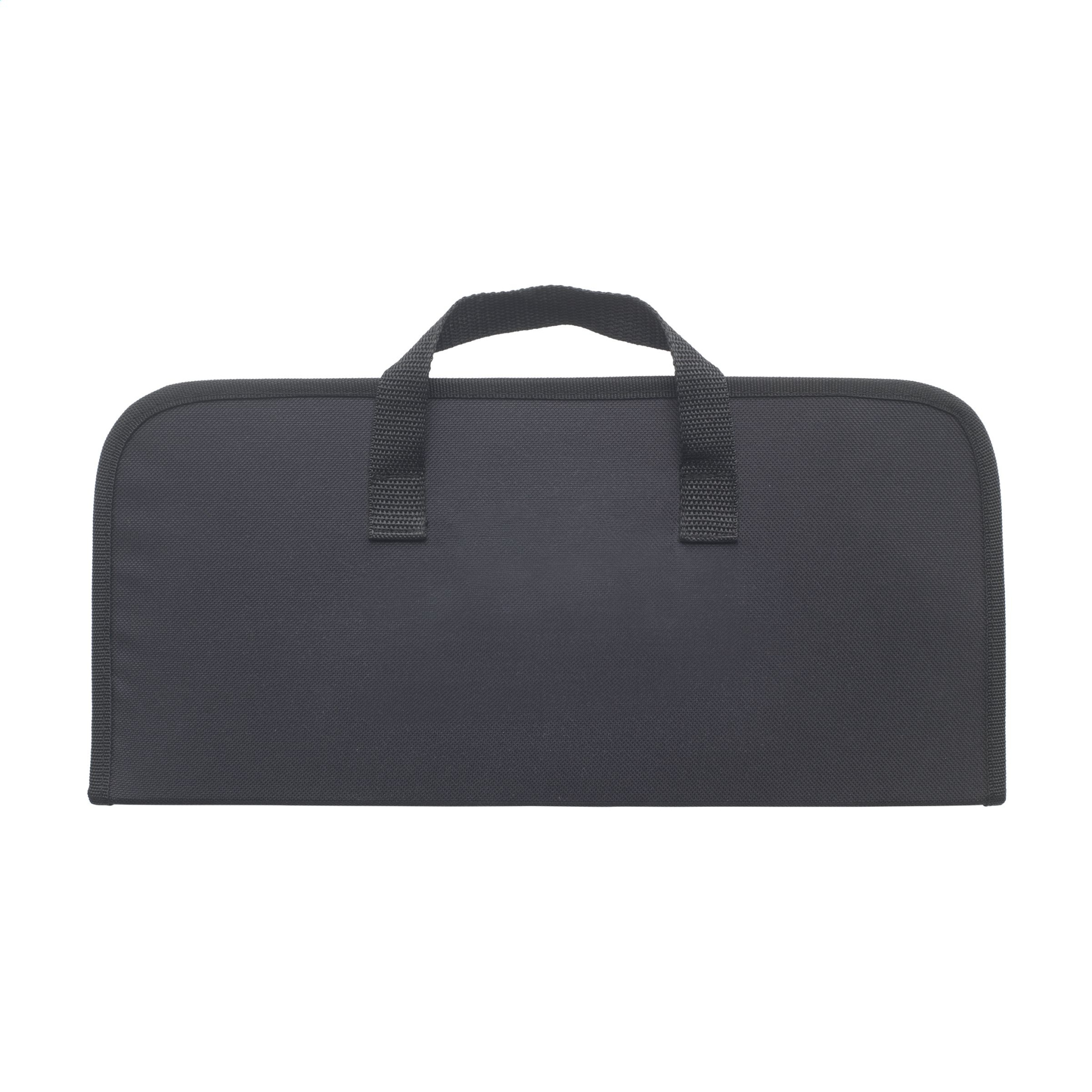 3 dalių kepsninės rinkinys, kurį sudaro viena mentelė ir vienas BBQ žnyplių rinkinys, taip pat vienas nerūdijančio plieno šepetys, skirtas kepsninei po naudojimo išvalyti. Visi trys priedai turi gumines rankenas. Šis patogus rinkinys tiekiamas 600D nailono maišelyje.