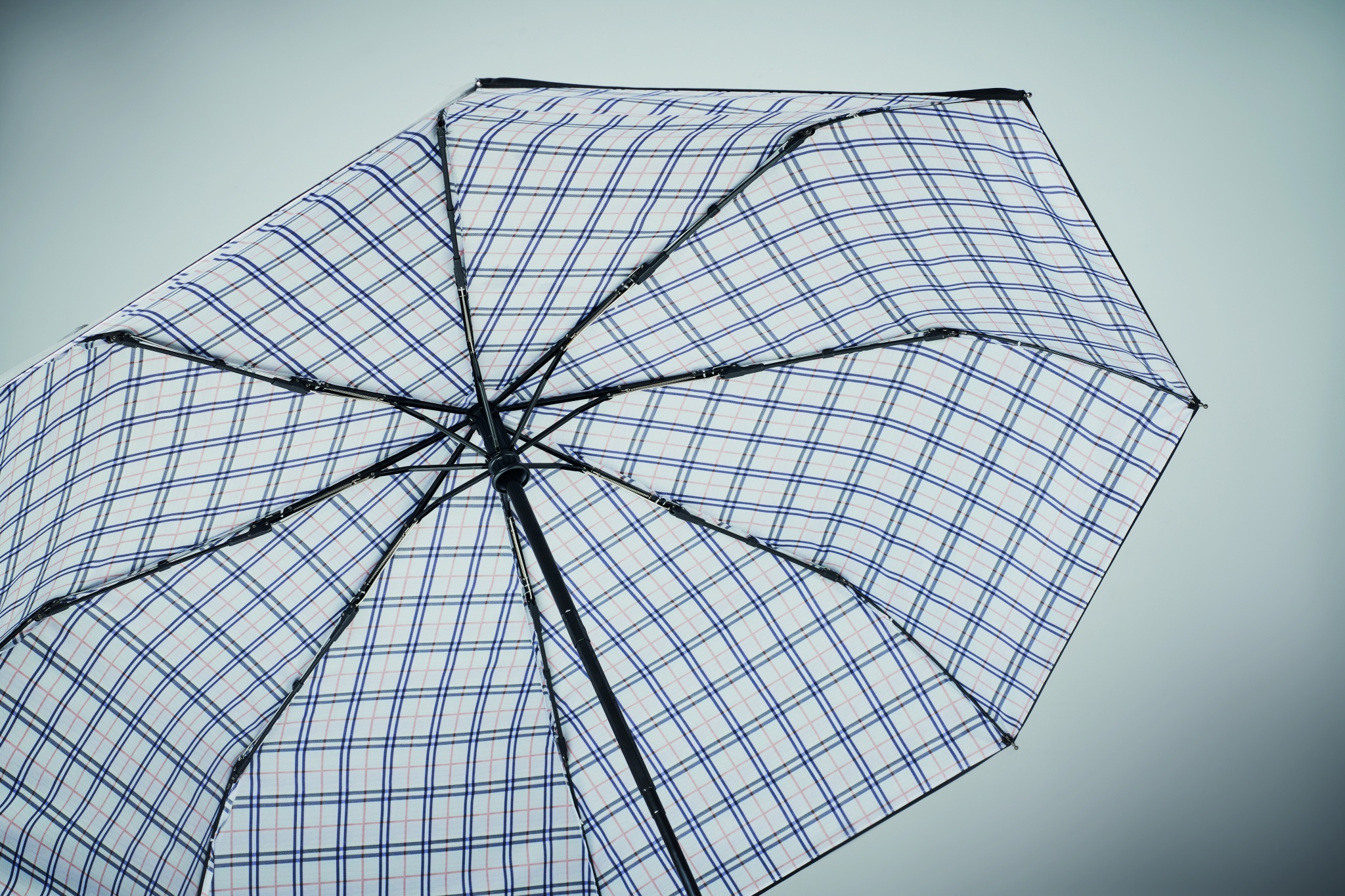 23 collu, trīskāršs, automātiski atverams/aizverams vēja necaurlaidīgs lietussargs divslāņu 190T pongejā ar rūtainu iekšpuses rakstu. Melns rāmis un vārpsta. Divu sekciju melna stikla šķiedras niķelēta vidusdaļa. Izliekts koka rokturis.