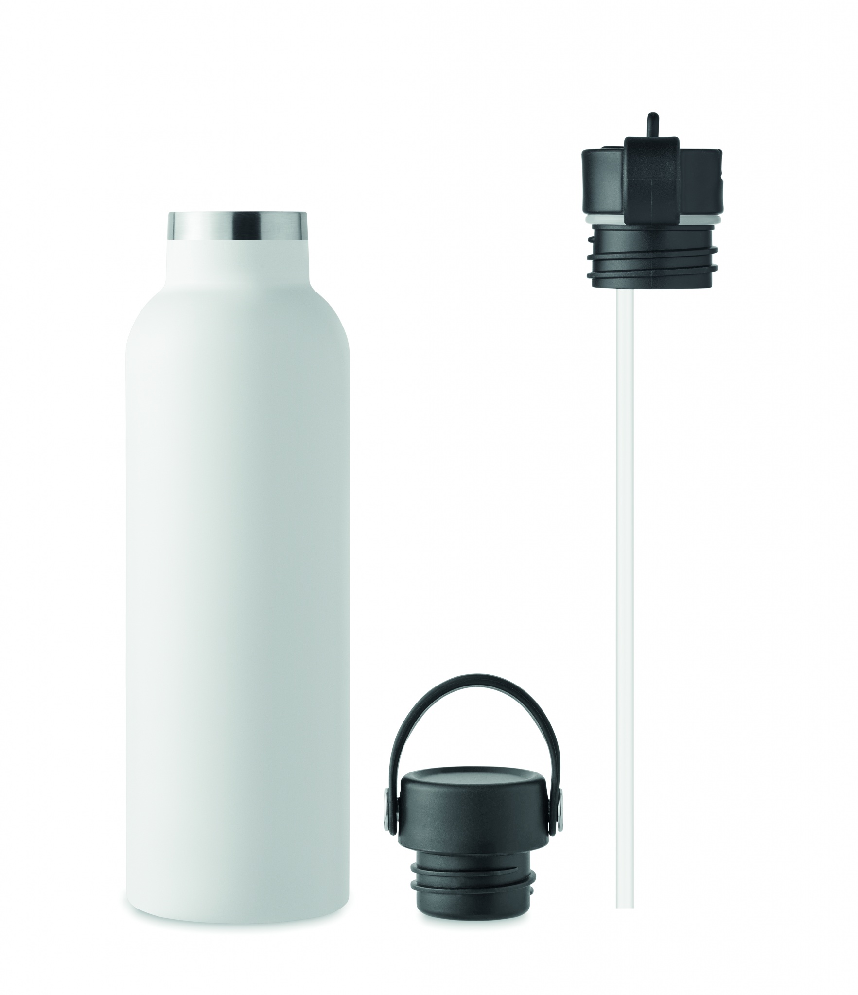 Divsienu pārstrādāta nerūsējošā tērauda (90% pārstrādāta nerūsējošā tērauda un 10% nerūsējošā tērauda) izolēta vakuuma pudele ar necaurlaidīgu skrūvējamu vāciņu un papildu maināmu iebūvētu salmu vāciņu. Tilpums: 700 ml.