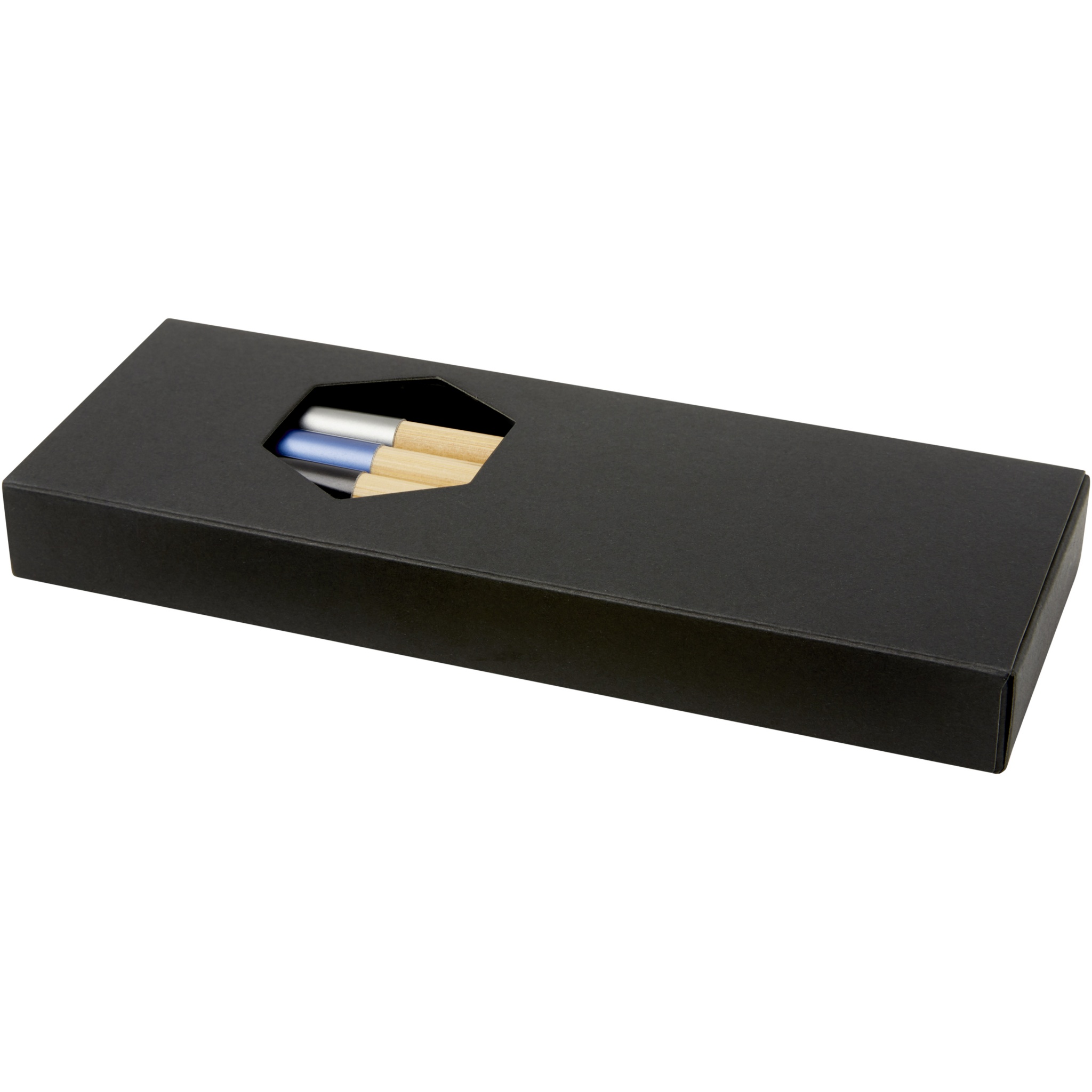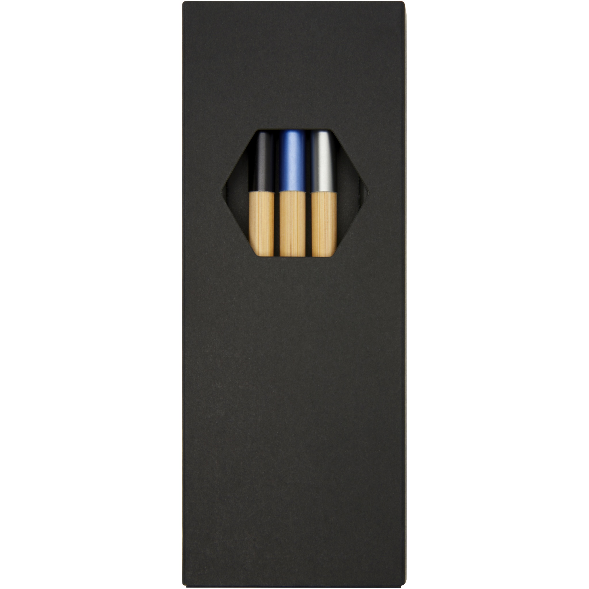Lodīšu pildspalvu komplekts ar ekskluzīvu dizainu, kas sastāv no trim lodīšu pildspalvām ar krāsu akcentu. Lodīšu pildspalva ar zilu alumīnija plāksni ir iepriekš ielādēta ar zilu pildspalvu, bet pārējās divas pildspalvas ir iepriekš ielādētas ar melnu pildspalvu. Iepakots melnā dāvanu kastītē.
