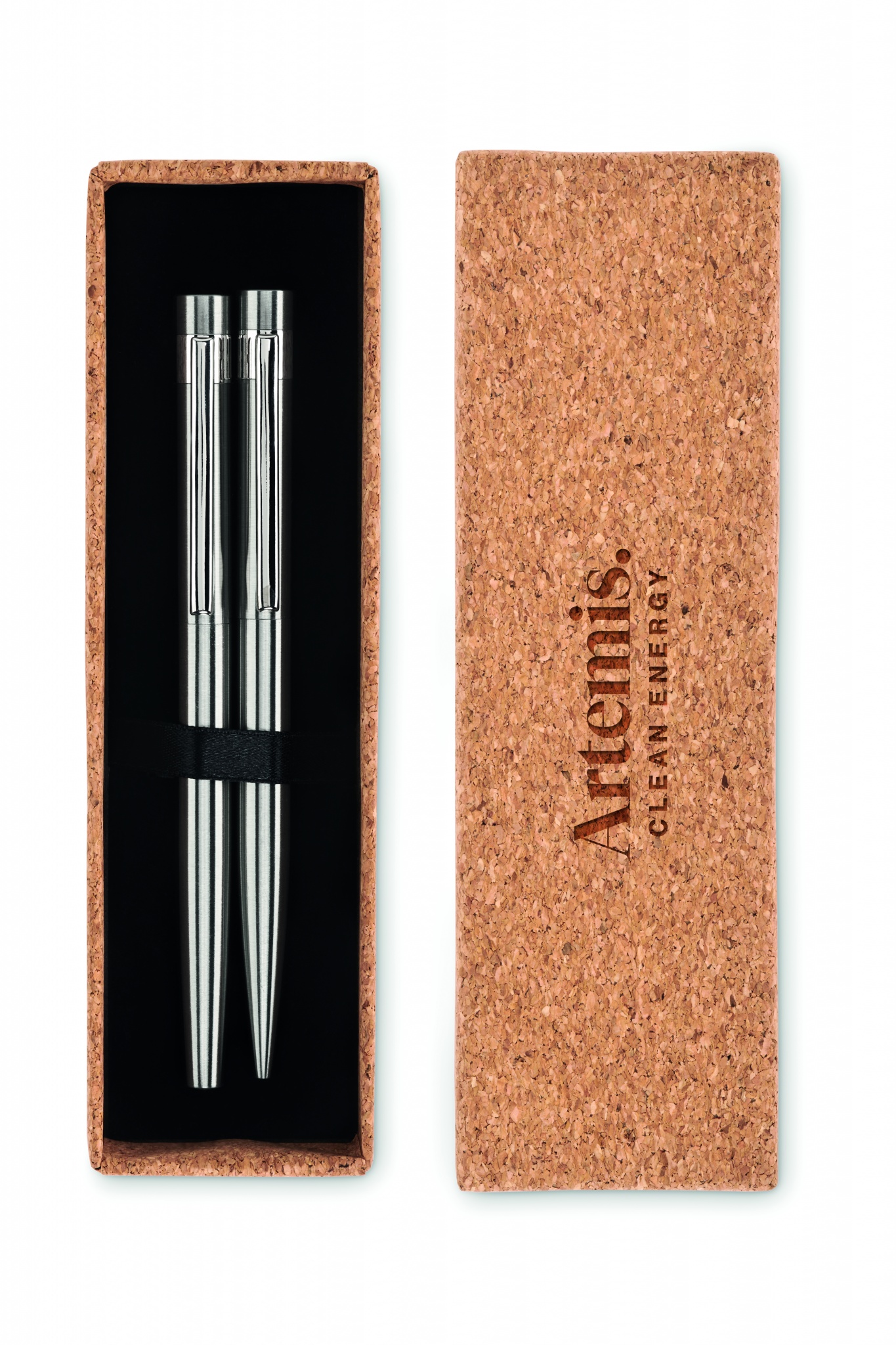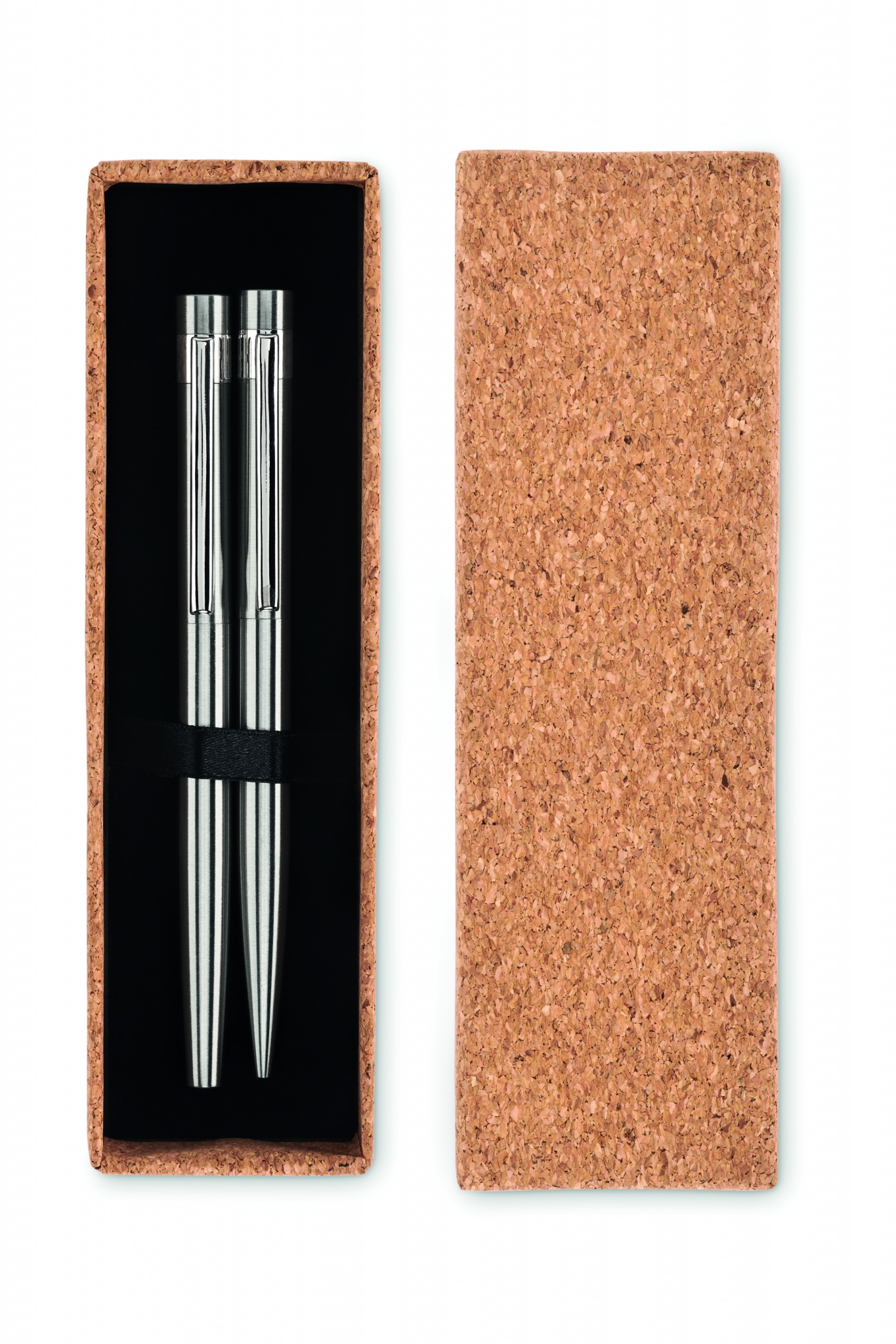 Pārstrādāta nerūsējošā tērauda pildspalvu komplekts ar lodīšu pildspalvu un rullīti. Prezentēts atbilstošā korķa kastē. Attiecīgi zila un melna tinte. Korķis ir 100% dabīgs materiāls. Tā strukturālā rakstura un virsmas porainības dēļ gala izdrukas rezultātam uz vienu vienumu var būt novirzes.