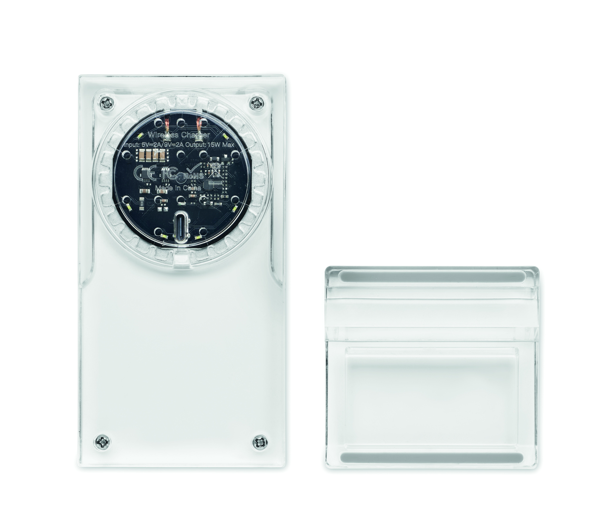 Wireless charger (15W) in acrylic with phone stand. When connected to a power source, it will charge your mobile device. Output: 9V/1.67A (15W) for quick charging.
