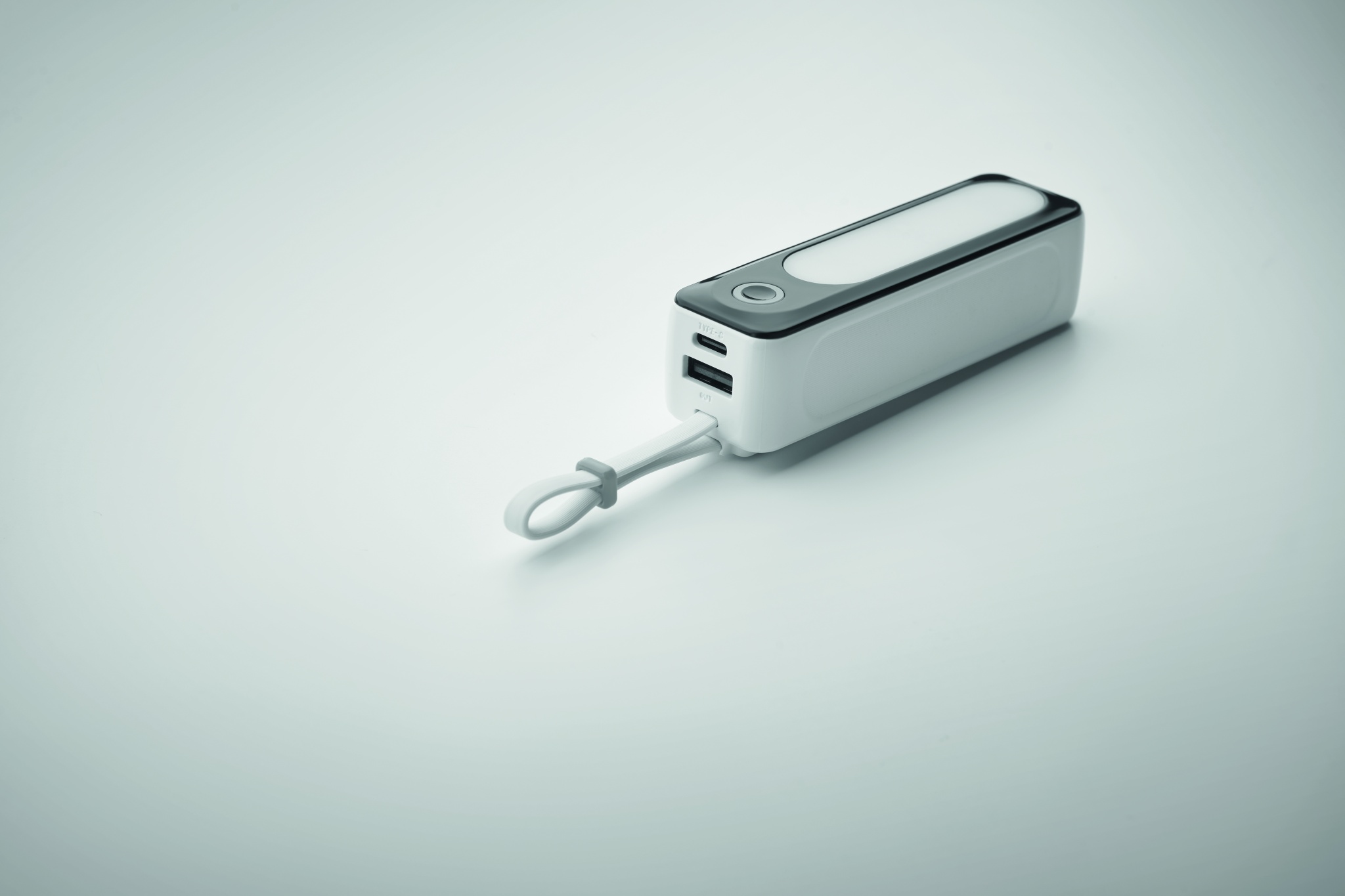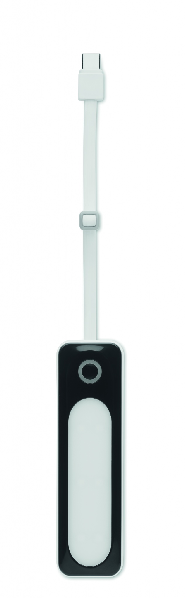 Аккумулятор емкостью 5000 мАч в пластиковом корпусе. Выход DC5V/2A. В комплекте индикатор с 4 лампочками (6 COB-светодиодов) и встроенный USB-кабель с разъемом Type C.