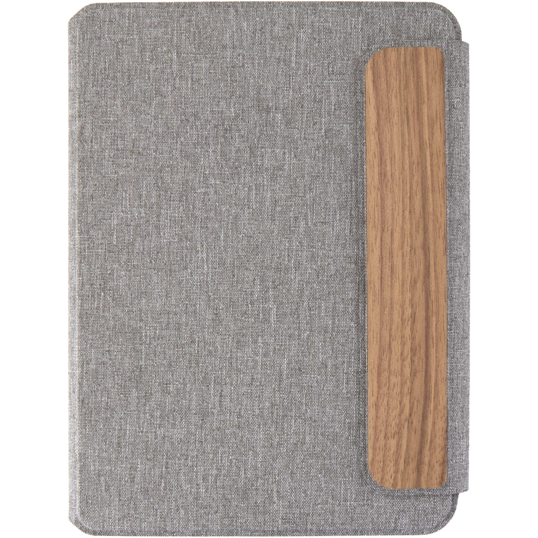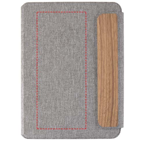 Портфель A5 Andean частично изготовлен из переработанного полиэстера, сертифицированного RCS, что является более экологичной альтернативой за счет снижения зависимости от первичных материалов. Изделие, сделанное с использованием технологии прецизионной сварки, имеет гладкий серый твердый внешний слой с закругленными углами, а также магнитную застежку, дополненную изысканной деталью из орехового дерева, что придает современный и изысканный вид. Внутри вы найдете блокнот в мягкой съемной обложке с 64 линованными листами кремового цвета, изготовленный из бумаги плотностью 80 г/м², полученной из ответственных источников. Поставляется в обложке из крафтовой бумаги.