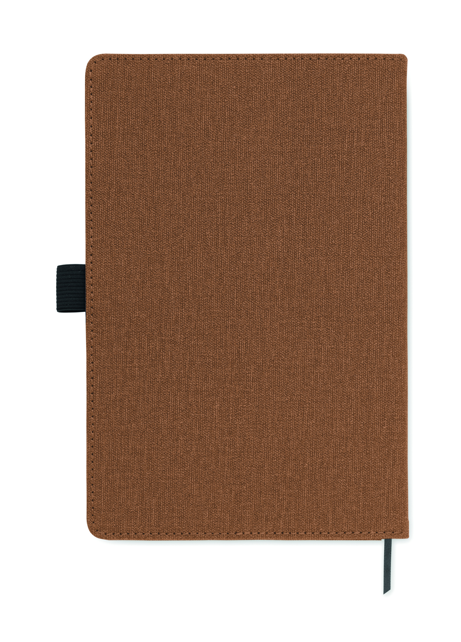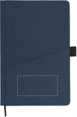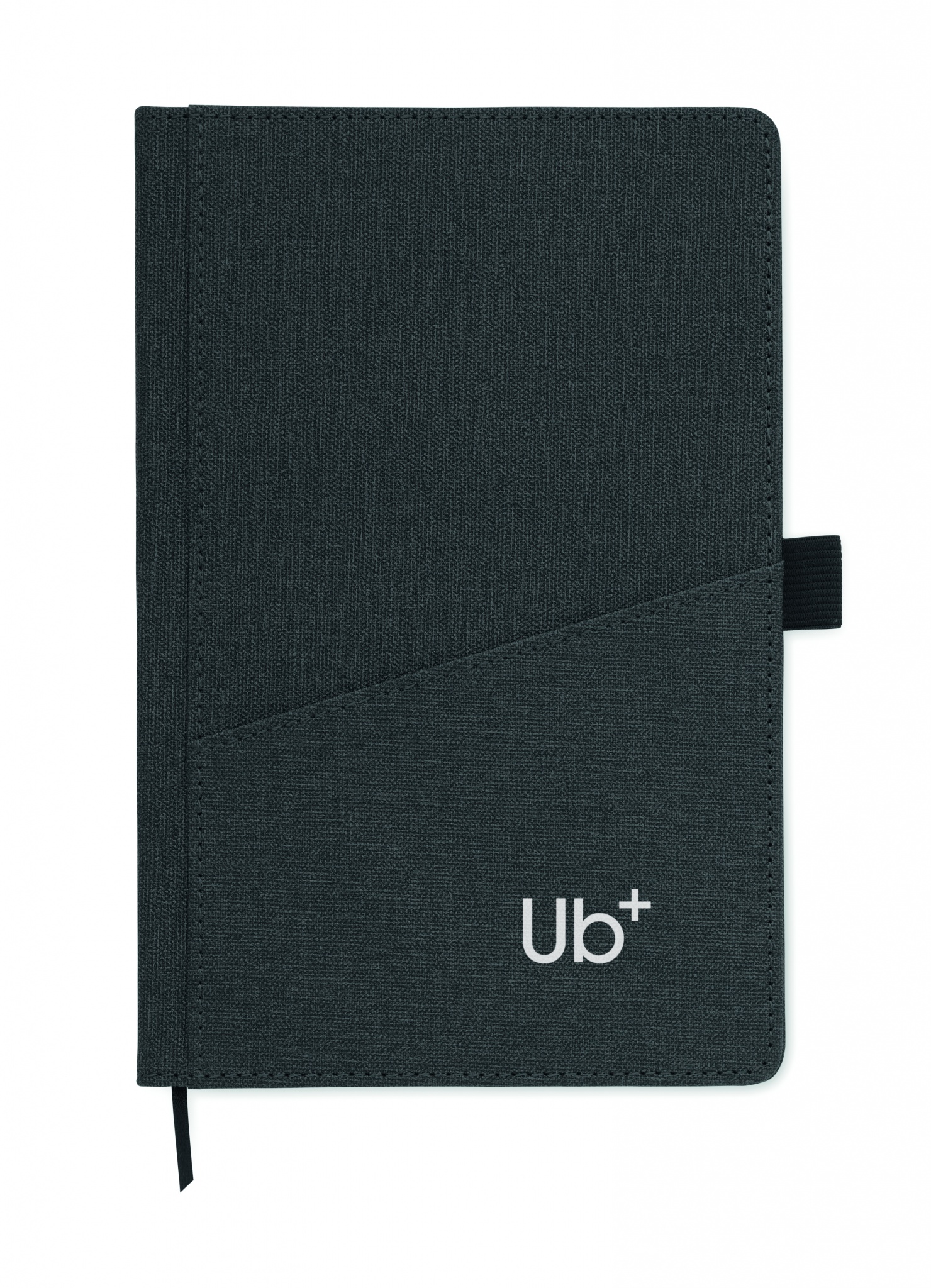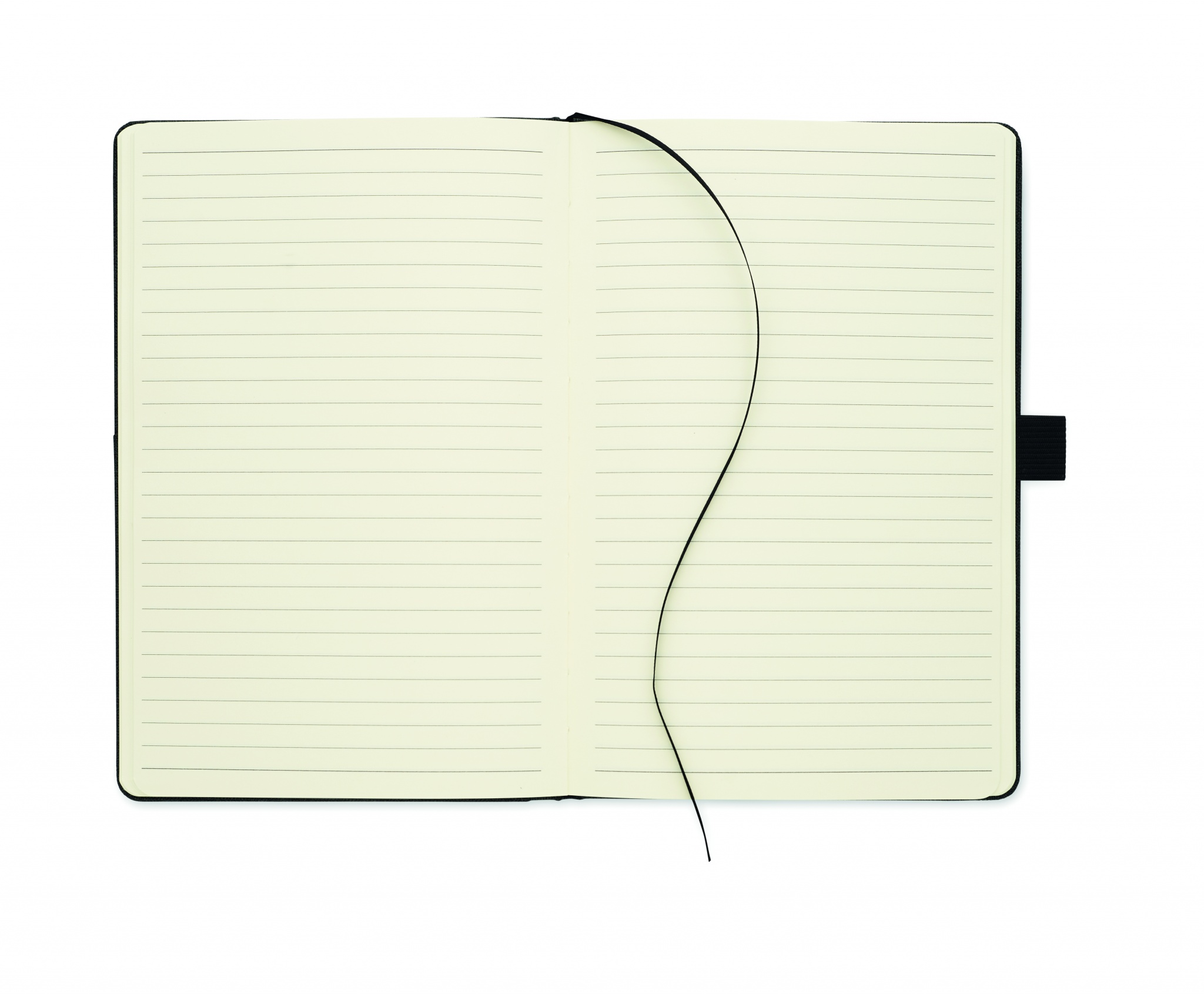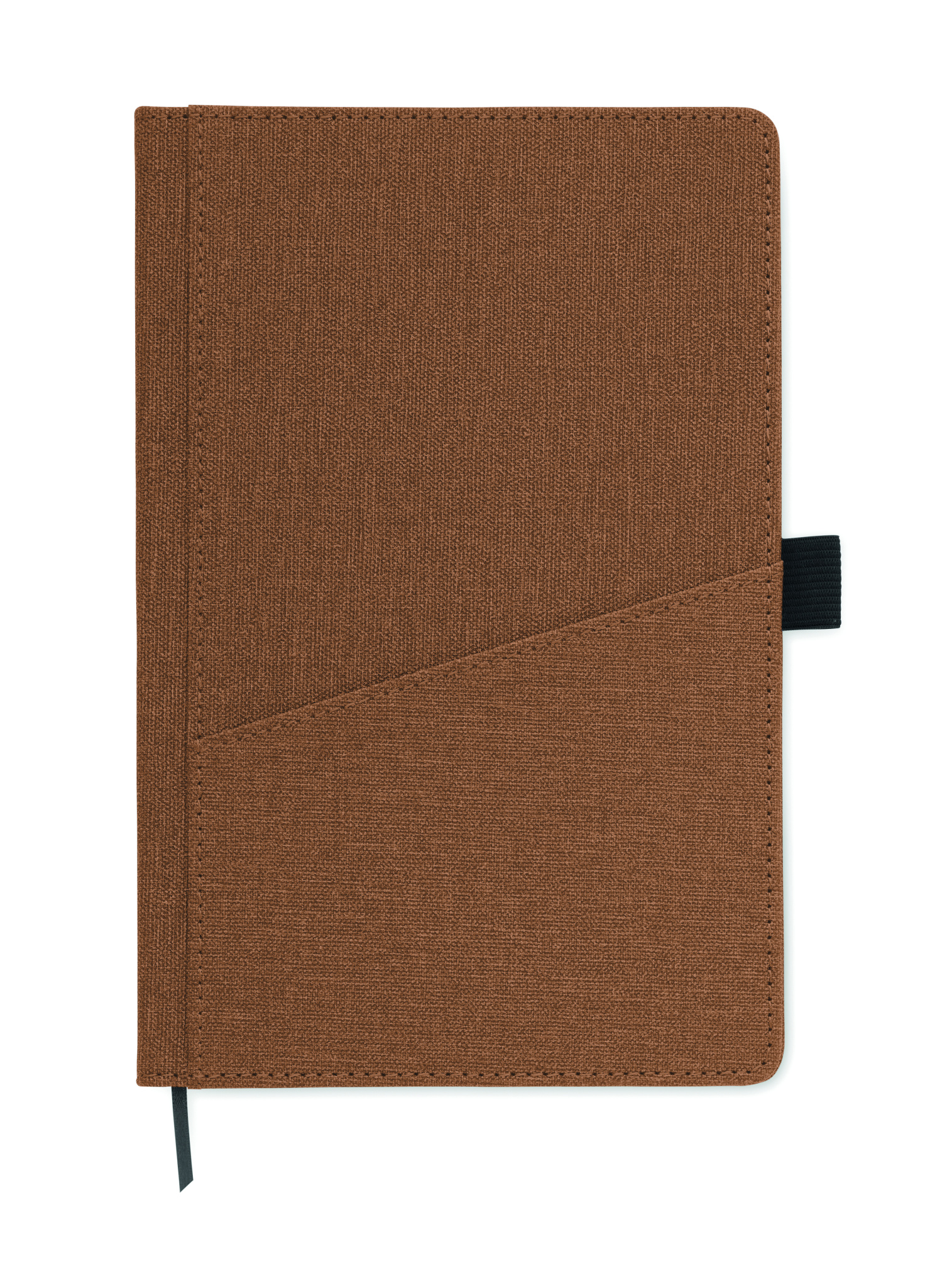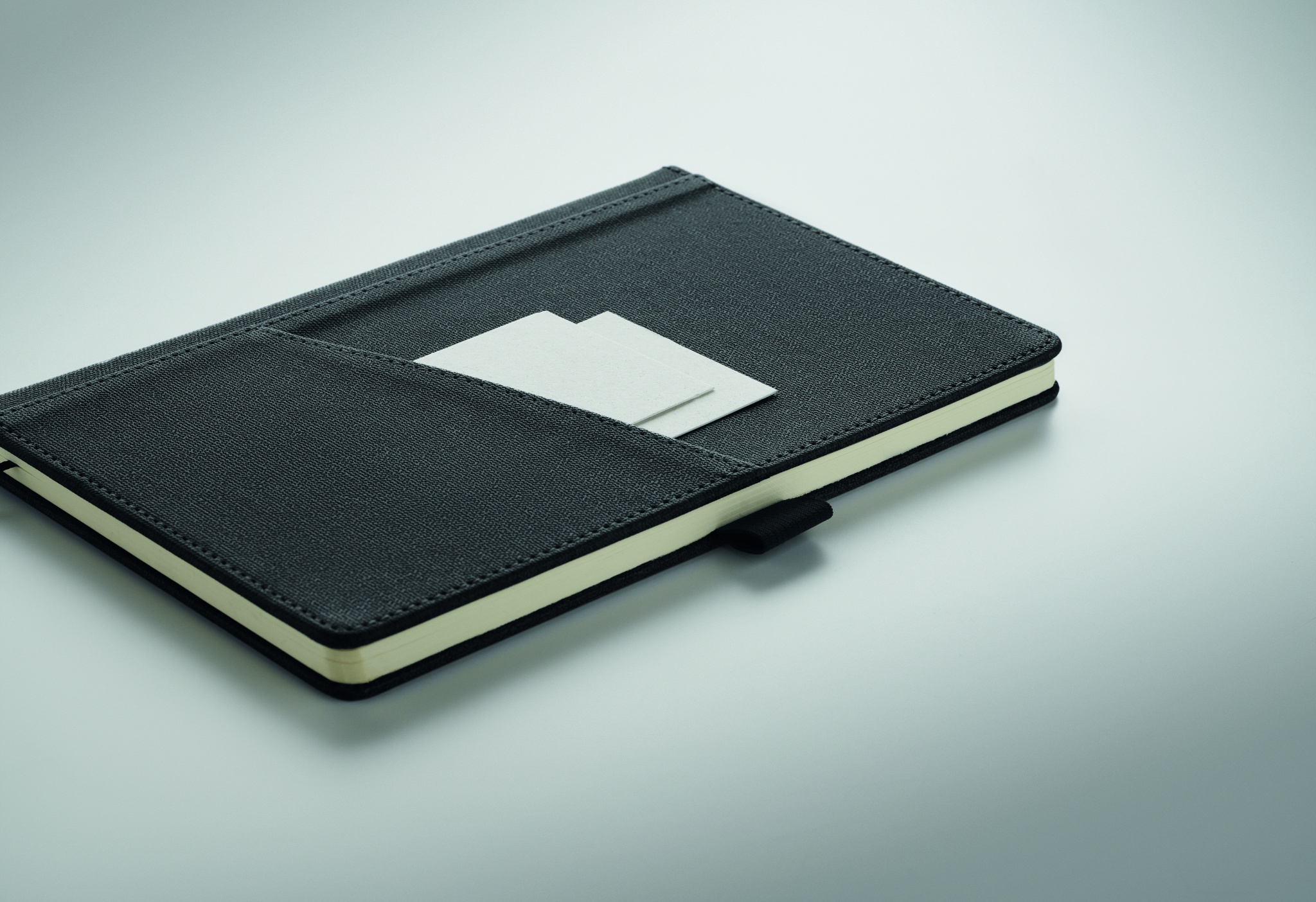 Блокнот формата А5 в твердой обложке из полиуретана с передним карманом для телефона и петелькой для ручки. В переплете. 160 линованных страниц из переработанной бумаги (80 листов). Закладка-лента.