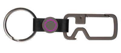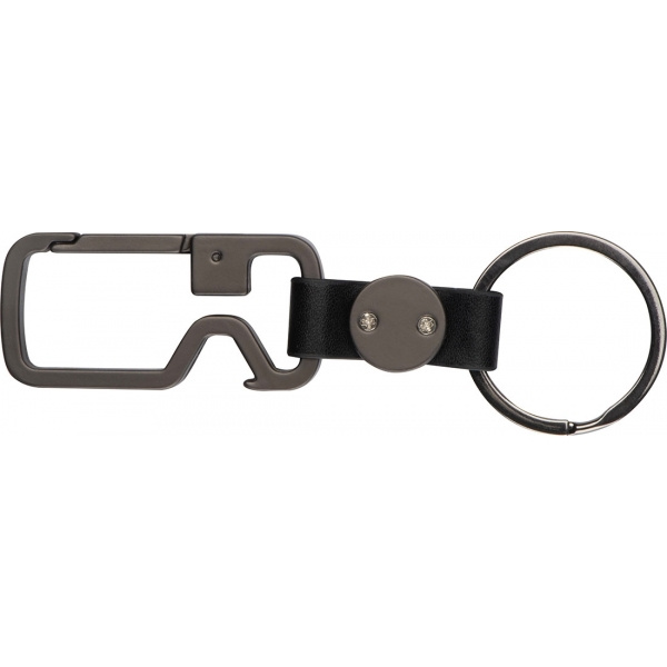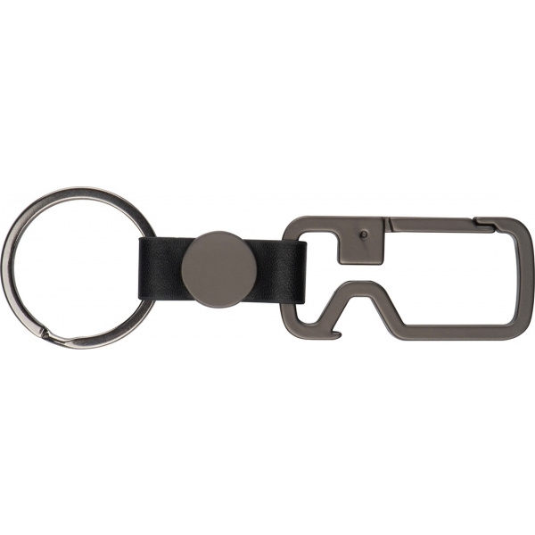 Брелок графитового цвета с карабином, кольцом для ключей и открывашкой для бутылок. Ваш логотип будет выгравирован на круглой детали.