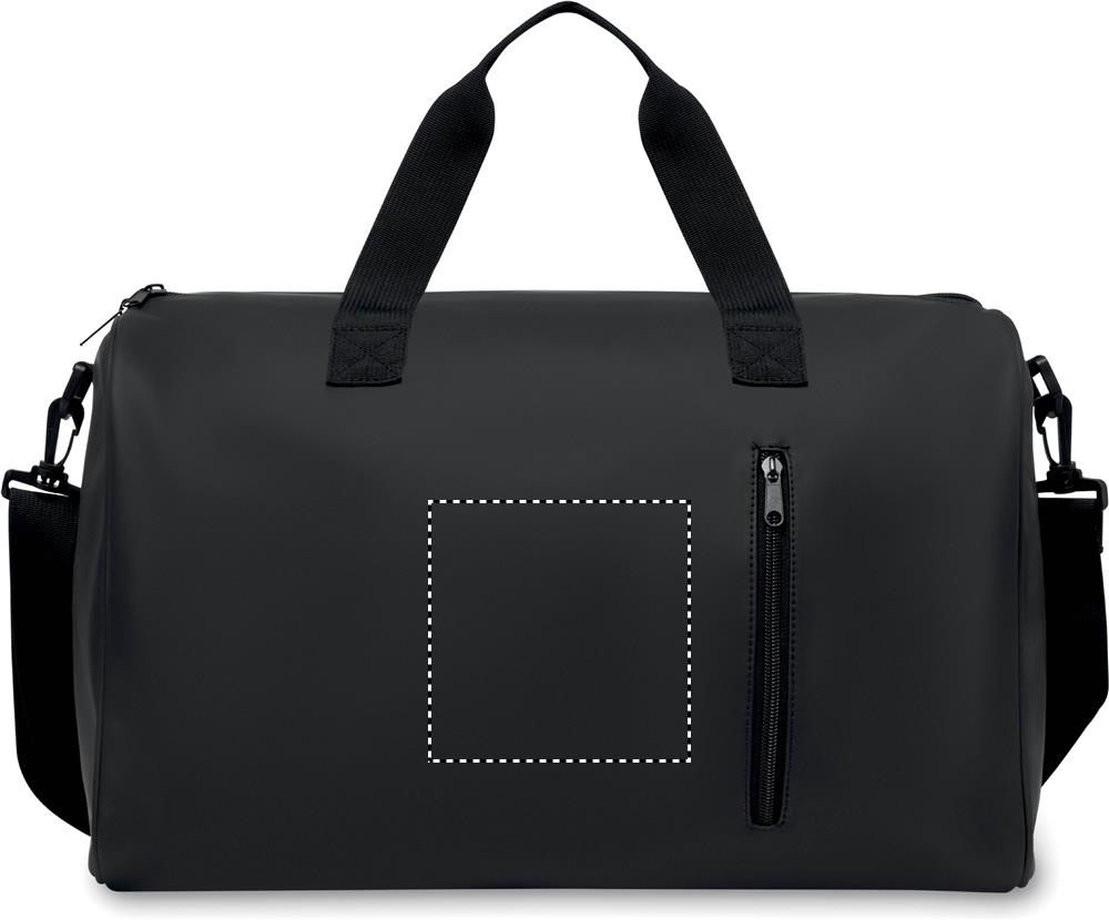 Duffle bag in soft PU with foam reinforcement to the base. One main compartment, zippered front pocket. 210D RPET polyester lining. 2 handles and one adjustable and detachable shoulder strap