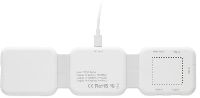 Magnetic charging station in ABS. 3 wireless charging spots. 1 x 15W, 1 x 5W for TWS and 1 Apple Watch charger (3W). 2 Type-C & 2 USB-A HUBS. Integrated cable input: connector from Type-C to USB-A.