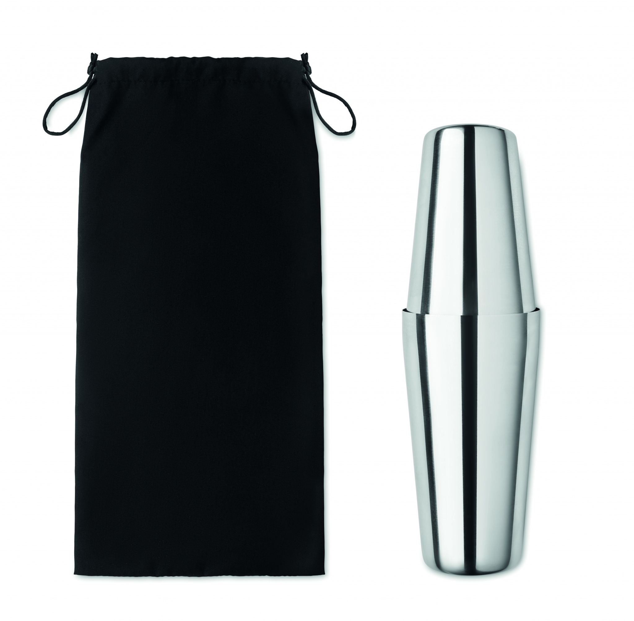 Коктейльный набор из нержавеющей стали с шейкером 750 мл, мерным стаканчиком (30 мл) и ситечком в хлопковом мешочке.