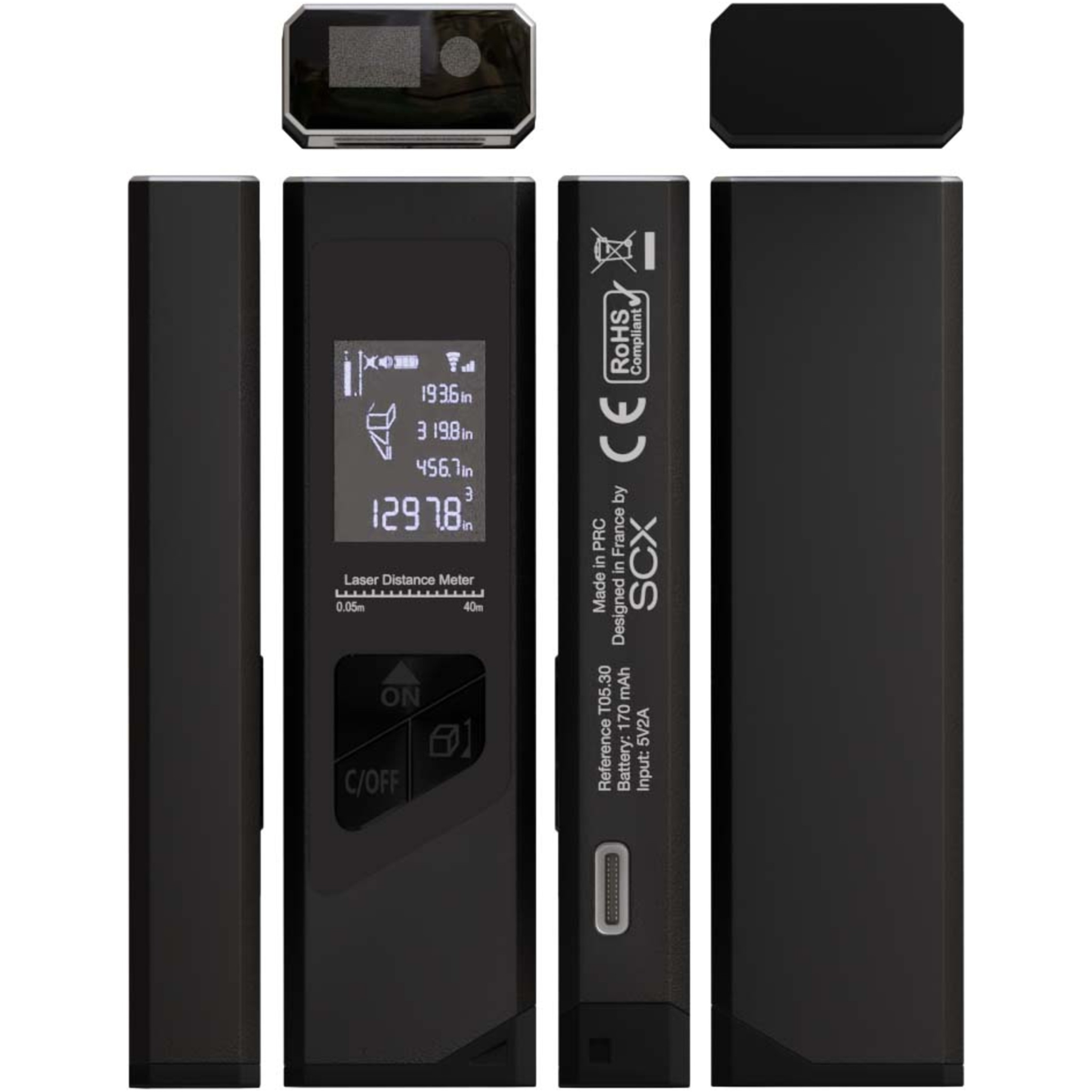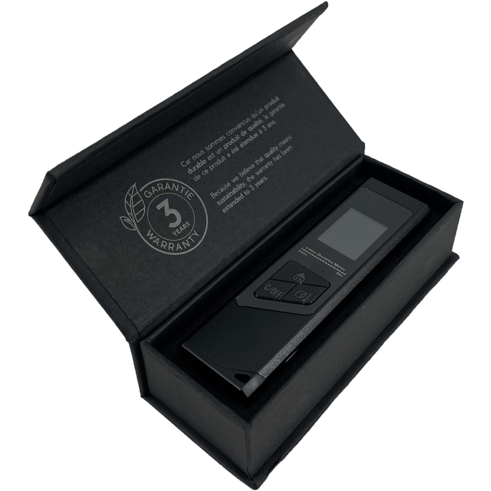 Мини-лазерный телеметр обеспечивает более простой, быстрый и точный способ измерения площади, объема, а также имеет функцию формулы Пифагора. Благодаря технологии лазерной точности и режиму измерения в реальном времени он обеспечивает надежные измерения до 40 метров. Телеметр использует в качестве источника питания энергосберегающий литий-ионный аккумулятор емкостью 200 мА·ч и может измерять расстояние 2000 раз после полной зарядки. Имеет дисплей с подсветкой для удобного просмотра даже в темных местах. Размер: 9 x 2,4 x 1,1 см. Упаковывается в подарочную коробку (10,2 x 4,2 x 3 см) из переработанной бумаги с магнитным замком. Гарантия 3 года.