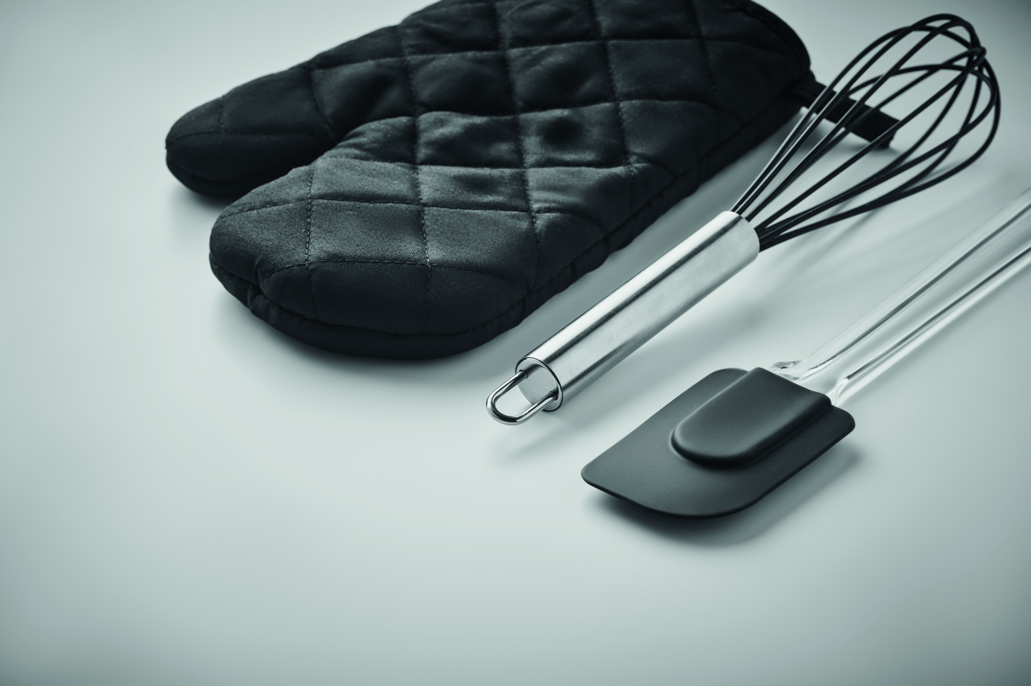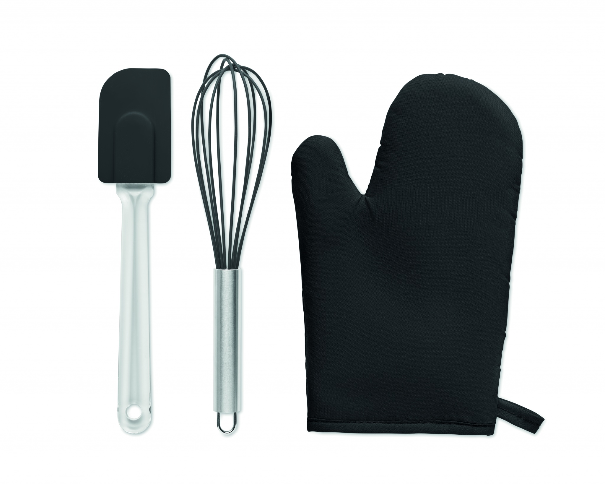 Набор посуды для выпечки. Включает перчатку для духовки из поликоттона (95% полиэстера и 5% хлопка), венчик и лопаточку из силикона.