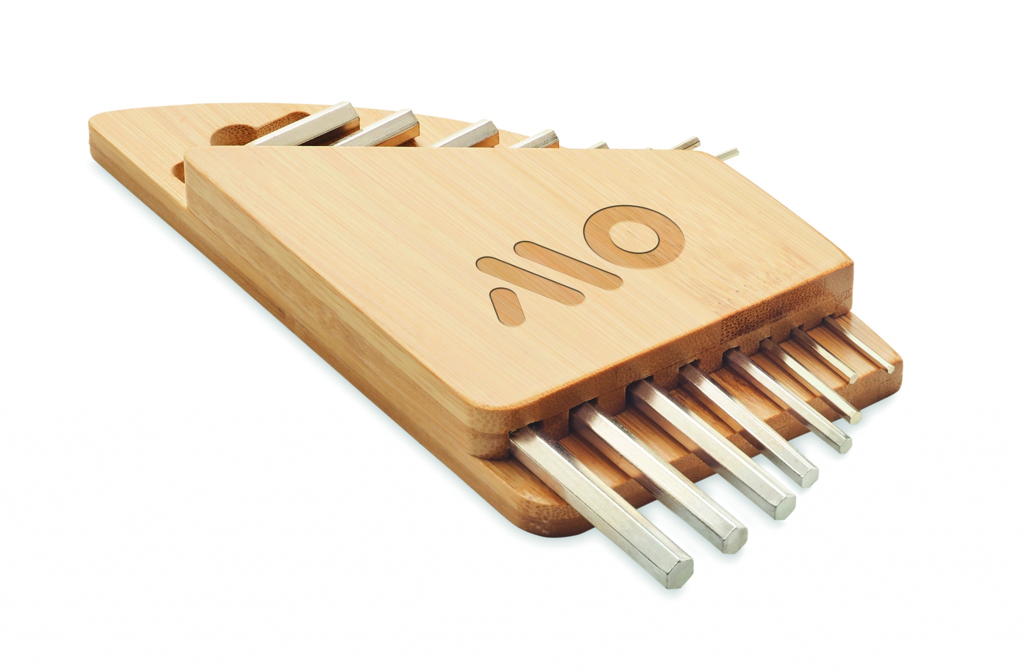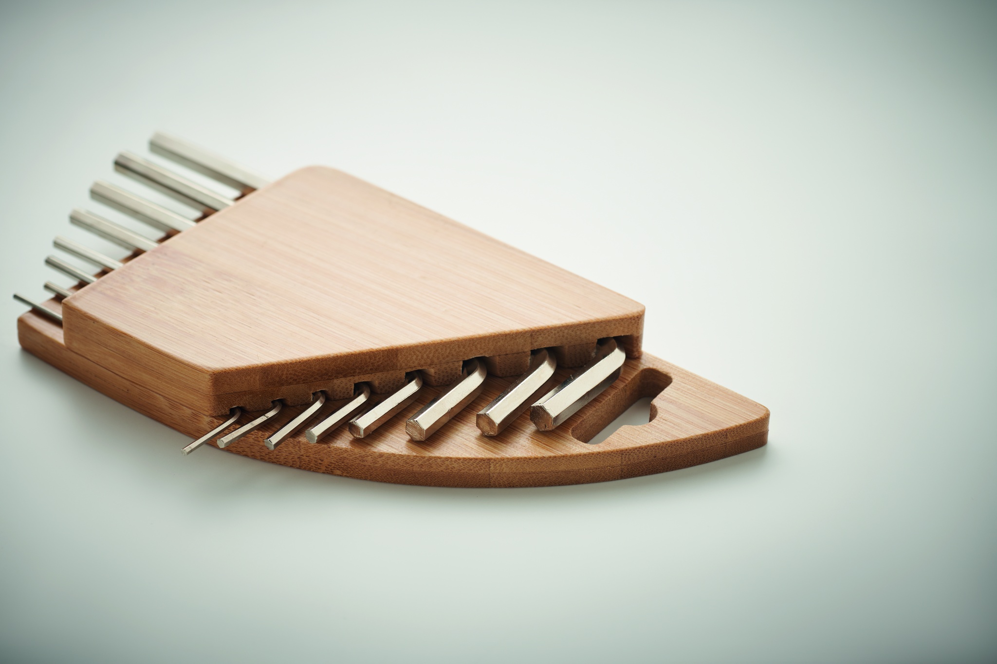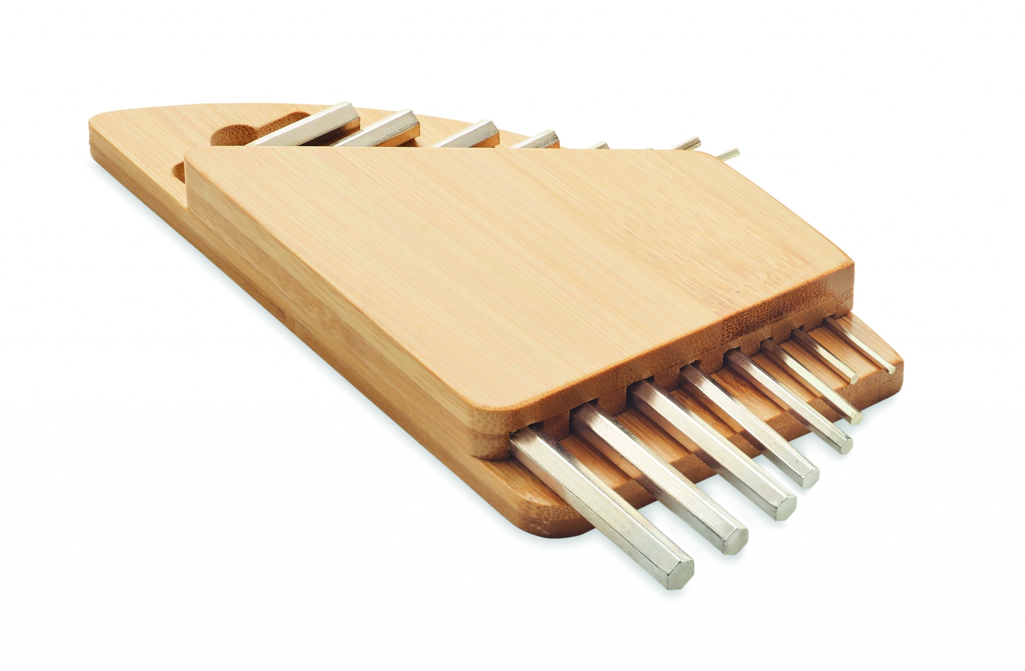 Набор шестигранных гаечных ключей в бамбуковом держателе. Включает ключи из углеродистой стали с никелевым покрытием следующих размеров: 1,5 мм - 2 мм - 2,5 мм - 3 мм - 4 мм - 5 мм - 5,5 мм - 6 мм.