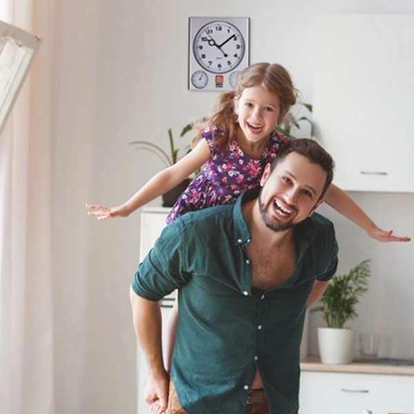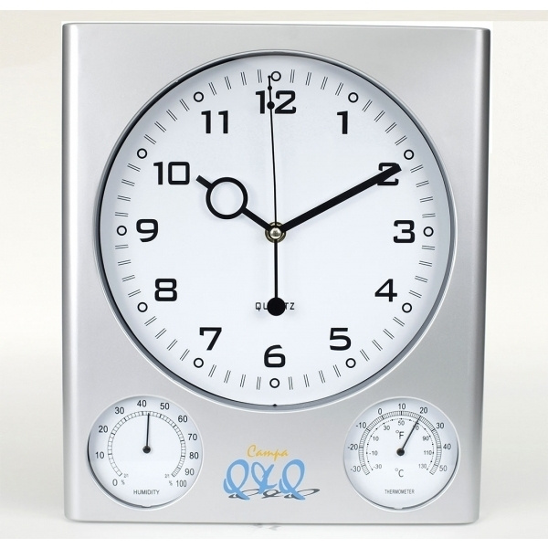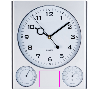 Элегантные настенные часы с тонким белым циферблатом и матово-серебристой поверхностью; отображают время, влажность и температуру. Мы напечатаем ваш логотип между гигрометром и термометром.