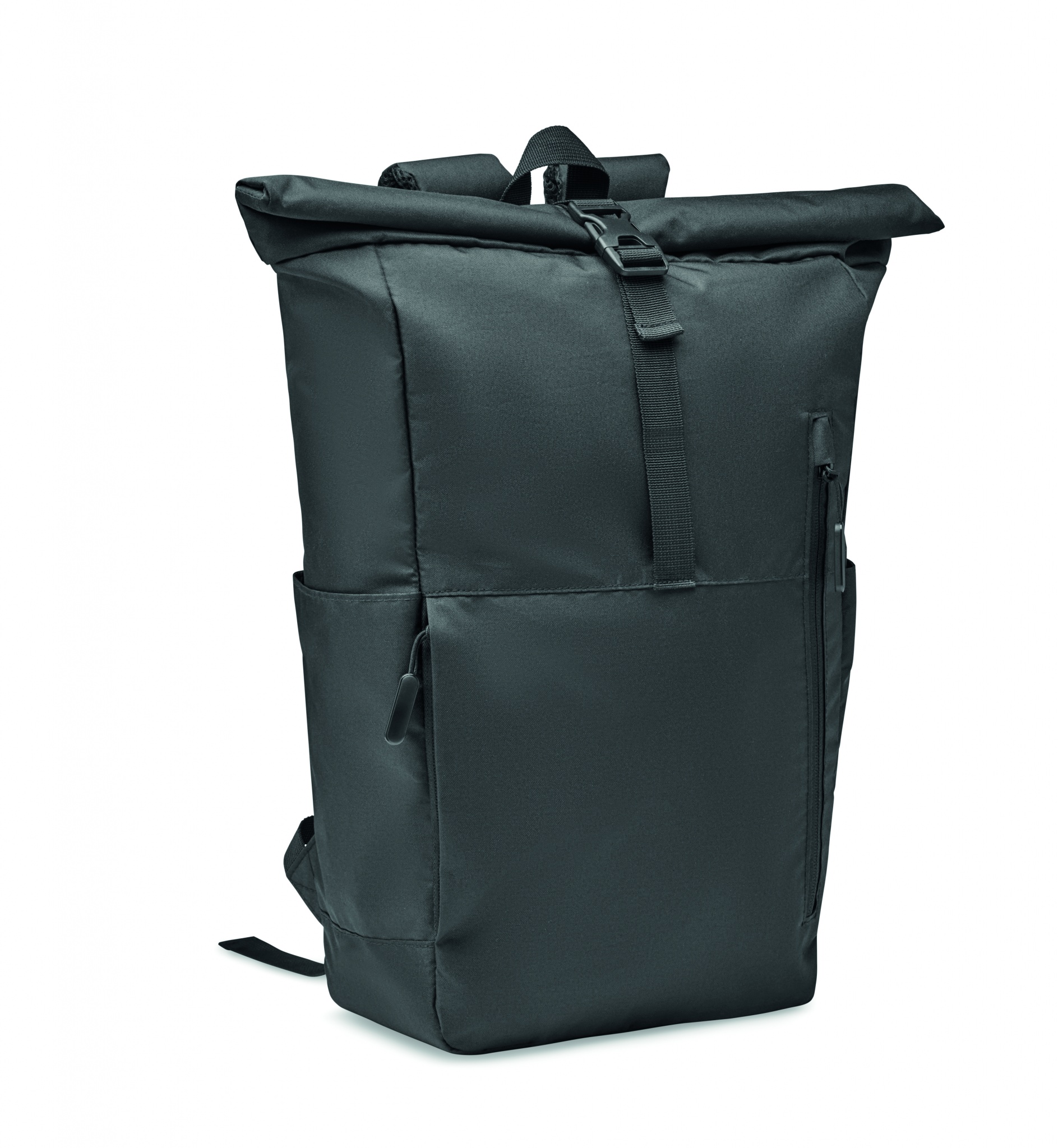 Рюкзак для ноутбука 15 дюймов с застежкой rolltop из полиэстера 300D RPET. Большой передний карман на молнии, скрытый боковой карман с небольшой петлей для карабина внутри. Карабин не предназначен для скалолазания.