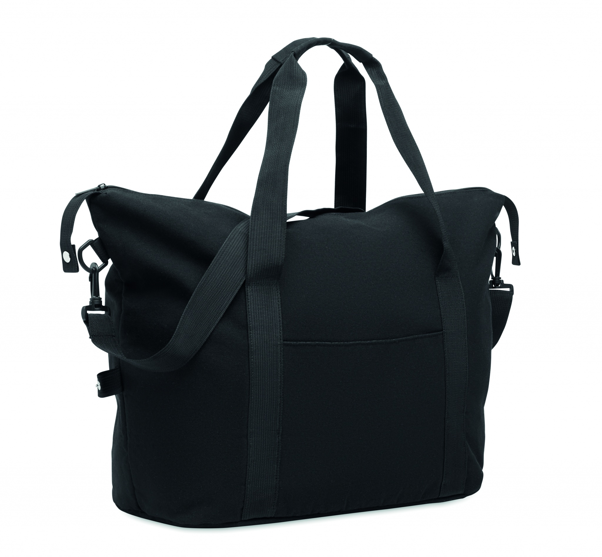 Дорожная сумка из переработанного хлопка и переработанного полиэстера (70%/30%) с подкладкой из полиэстера 210D RPET. Имеет передний накладной карман, задний карман на молнии, съемный и регулируемый плечевой ремень и мягкое дно. Крепление для чемодана на обратной стороне.