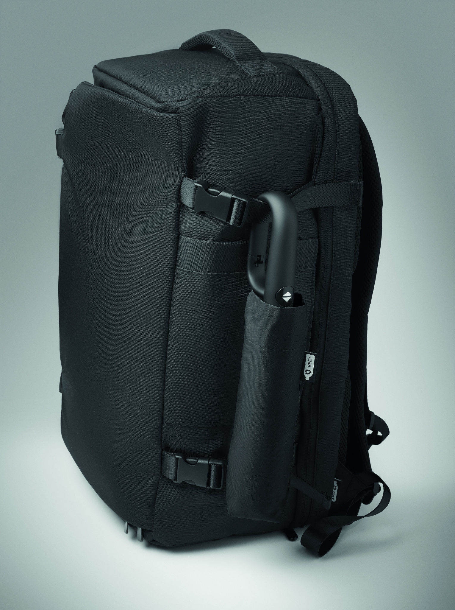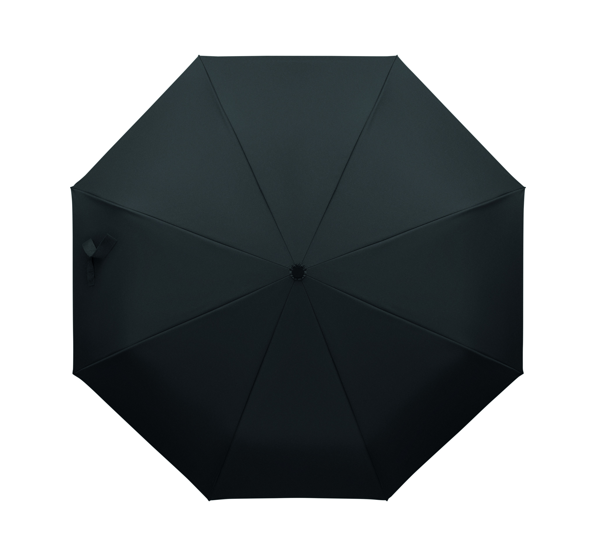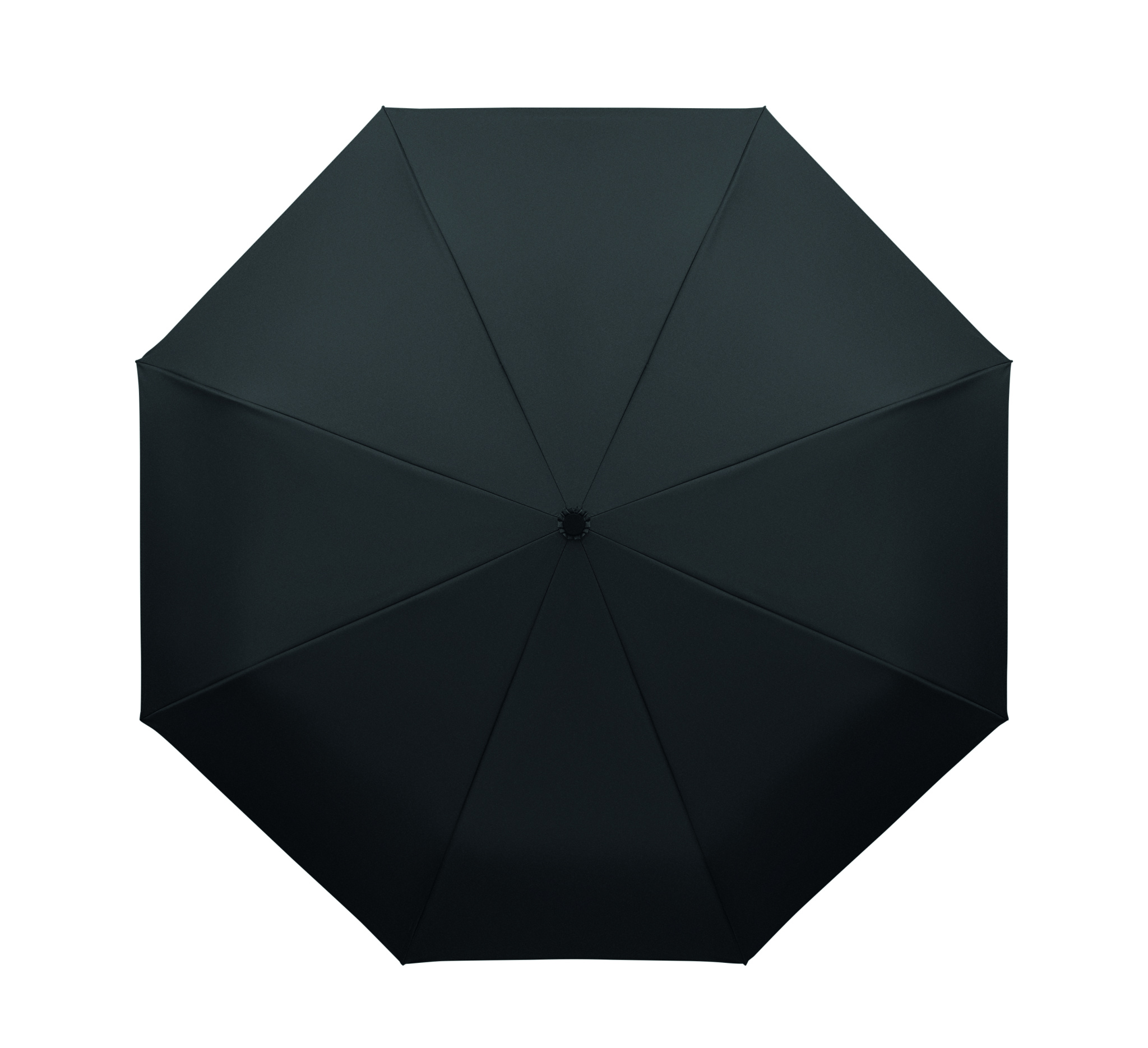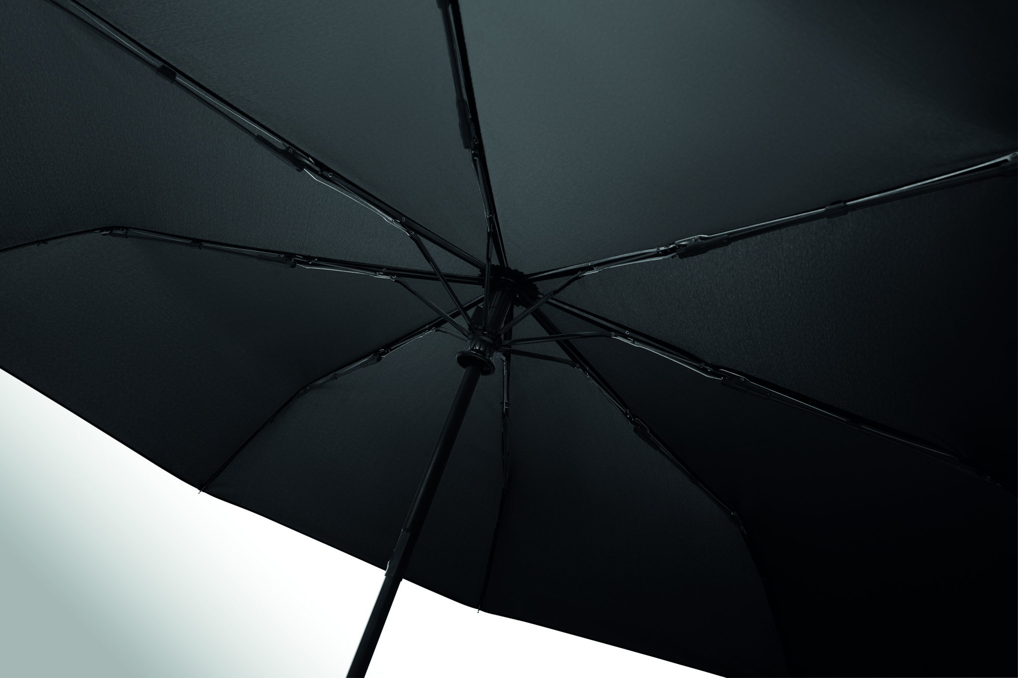 Vikbart 21'' vindtätt paraply med helt svartpläterad glasfiberram med 2 sektioner. Ribbor i glasfiber. 190T RPET pongee paneler. D-format karbinhakehandtag med gummifinish. Automatisk öppning och stängning. Inklusive påse