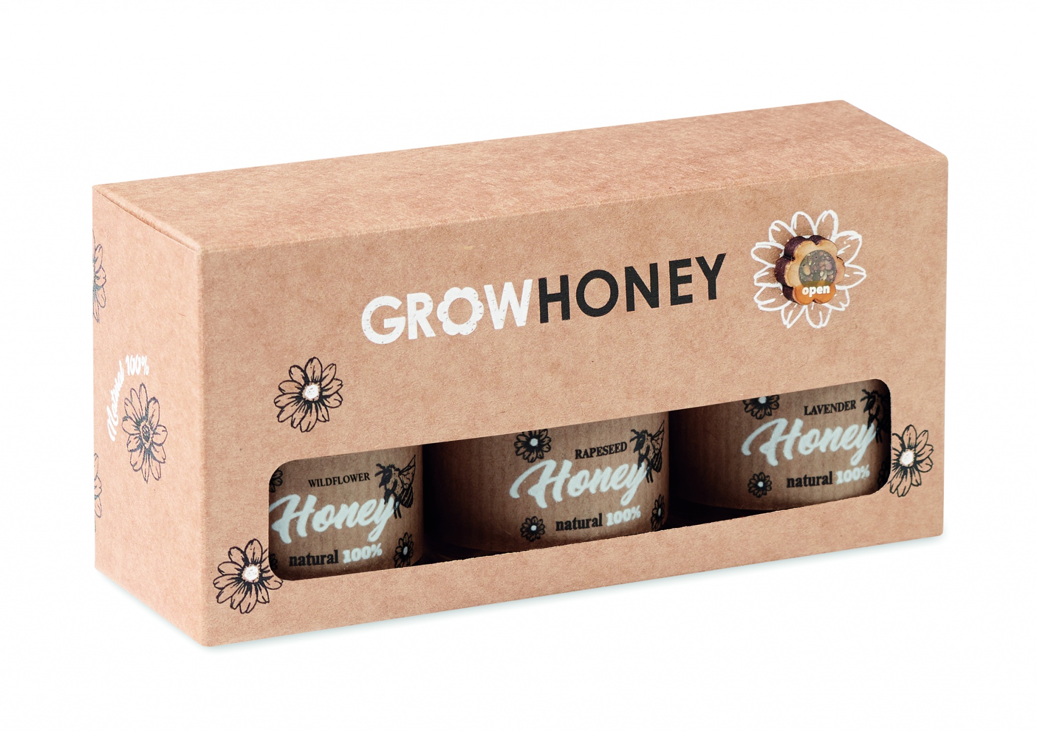 Set med 3st honungsburkar med en honungsdoppare i trä. Ängsblomshonung, lavendelhonung och rapshonung (50 g vardera). Levereras i en kartong av återviunnet papper. Inklusive frön från sommarblommor. Tillverkad i EU. (Marknadsförs ej i Norge).