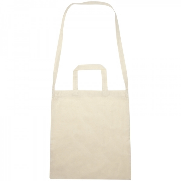 Naturfärgad, miljövänlig bomullsväska med två korta handtag och en lång bärrem. Vi trycker din logotyp på ena sidan.