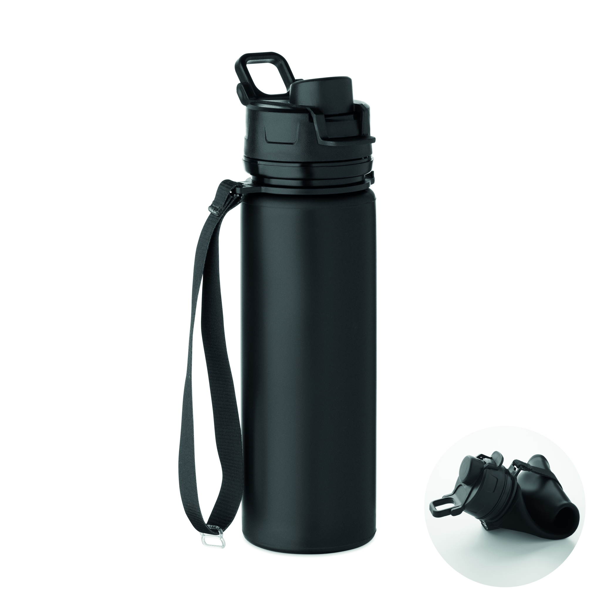 Hopvikbar sportflaska i silikon med PP-lock, handtag, polyesterrem och genomskinligt spänne för att säkra flaskan när den är hopvikt. Läckagefri. Volym: 500 ml.
