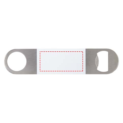 Flasköppnare i rostfritt stål med en stor färgad yta i mitten.