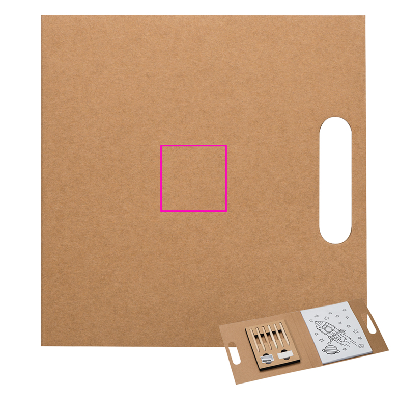 Målarboksmapp med återvunnet omslag, färgblock (30 ark), bärhållare, vässare, suddgummi och kritor i 6 olika färger. Din logotyp kommer att tryckas på omslaget.