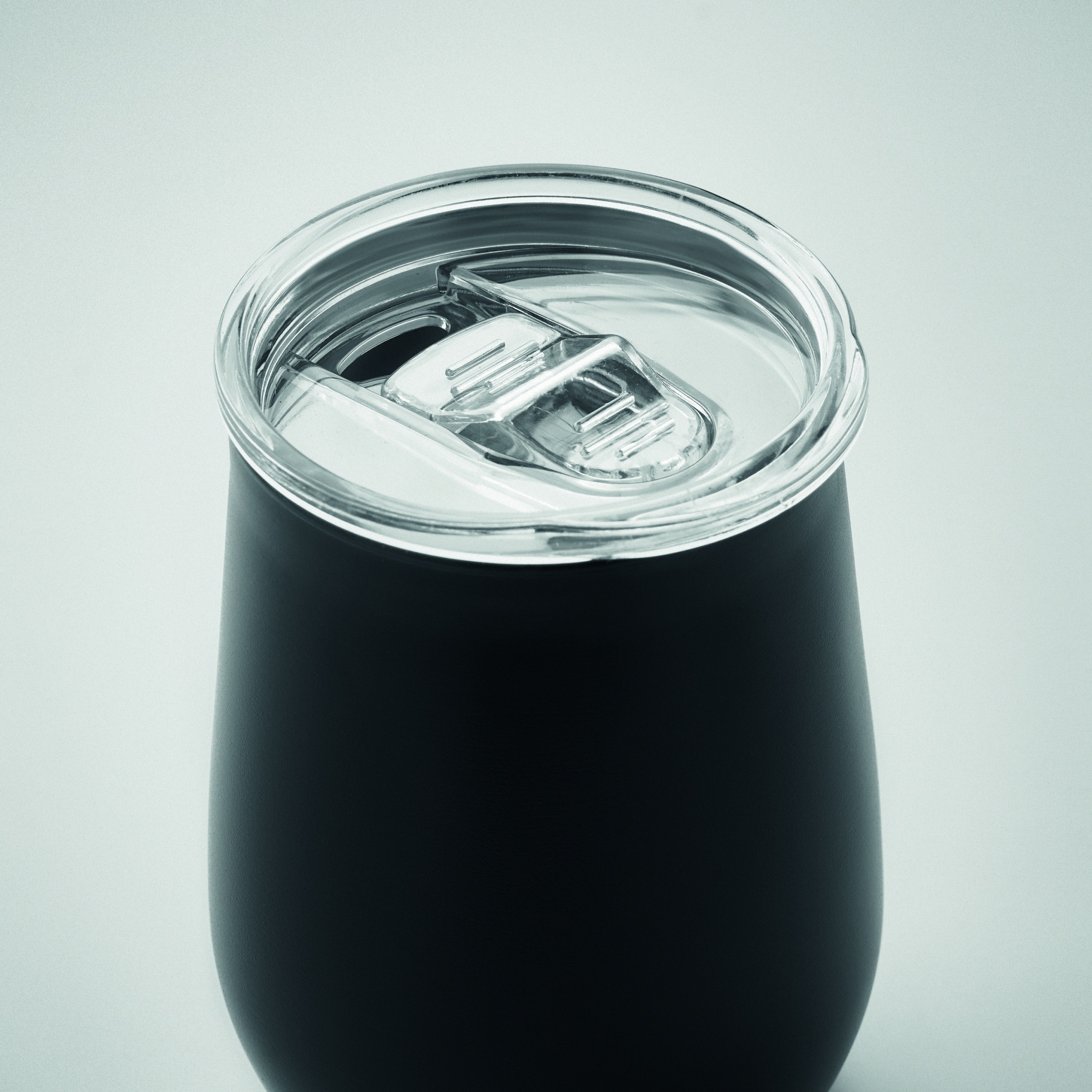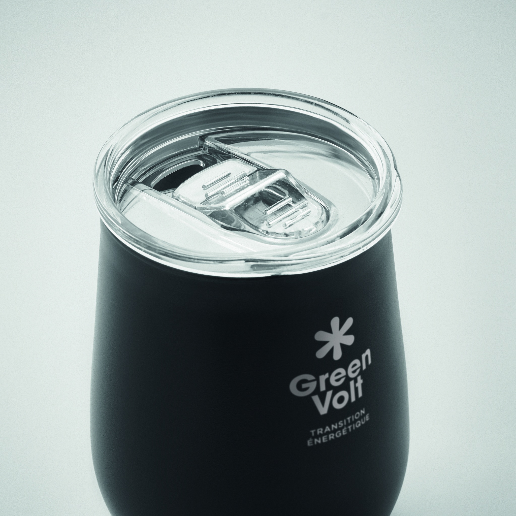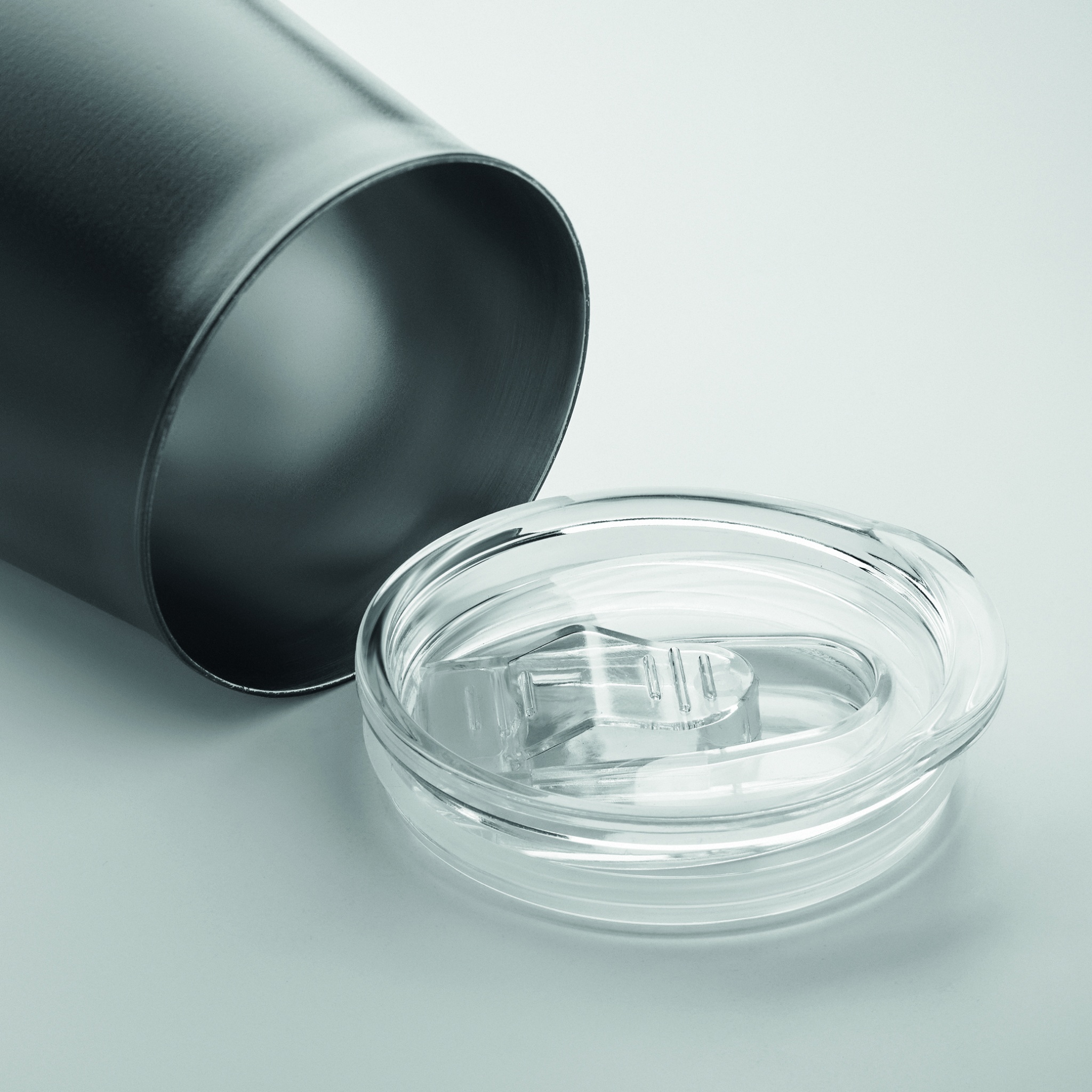 Återvunnet rostfritt stål (90 % återvunnet rostfritt och stål 10 % rostfritt stål) pulverlackerad mugg med lock med glidande dragkedjehål. Kapacitet: 500 ml.