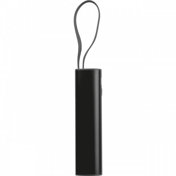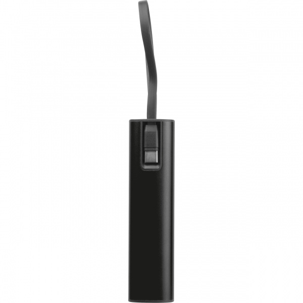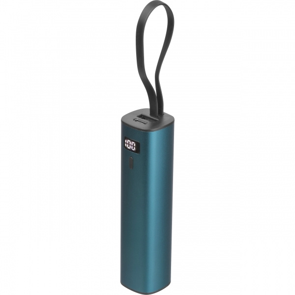 Powerbank tillverkad av aluminium med ett 5 000 mAh litiumjonbatteri, laddningsnivådisplay och integrerad USB-C-laddningskabel. En 30 cm laddningskabel av typ A till typ C ingår. Din logotyp appliceras med lasergravyr under skärmen.