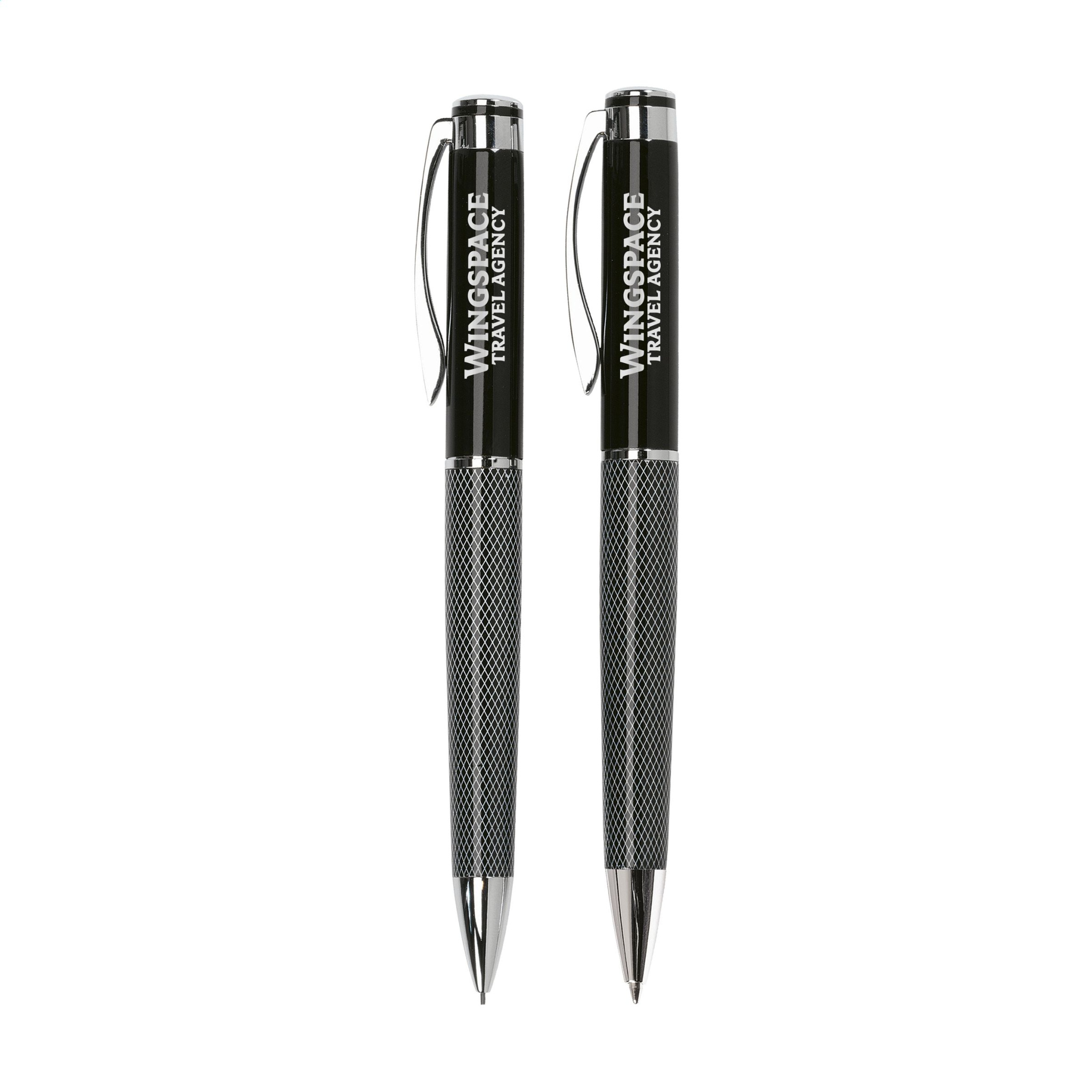 Skrivset: kulspetspenna med blått bläck med vridningsspets och påfyllningsbar penna med 3 HB-påfyllningar (0,9 mm). Båda med metalllister. I ett fall.