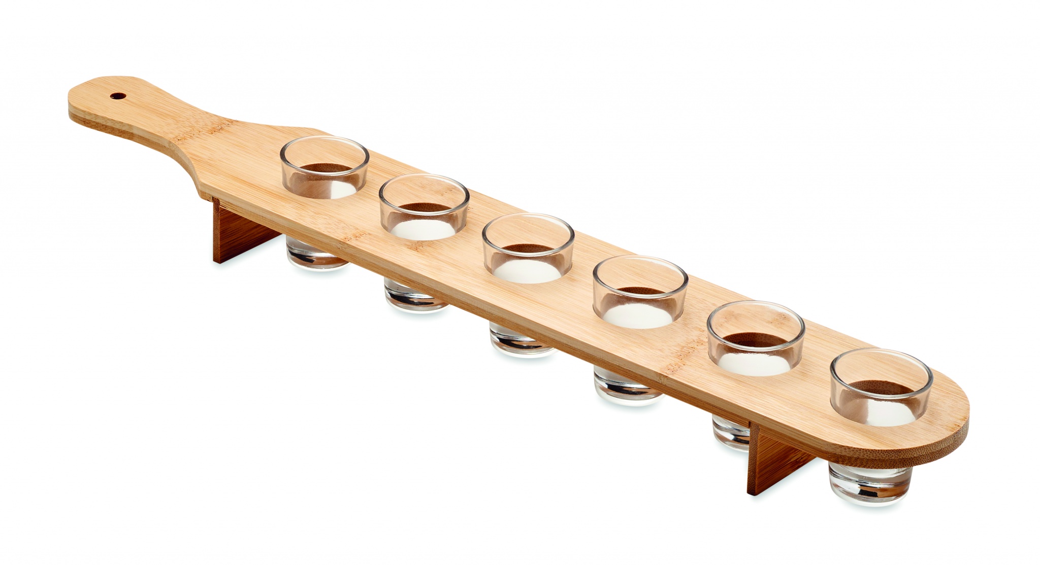 Uppsättning med 6 shotglas på en bambuplatta med handtag. Kapacitet: 20 ml.