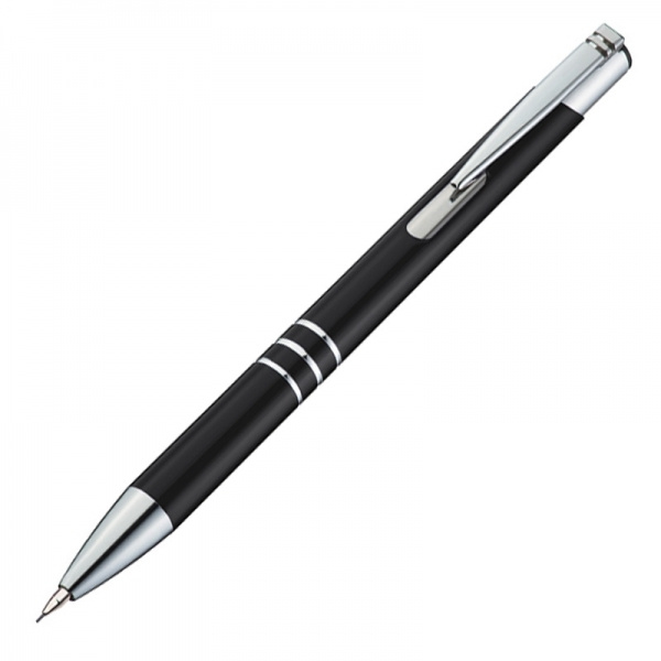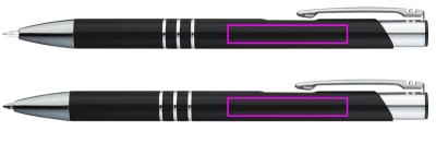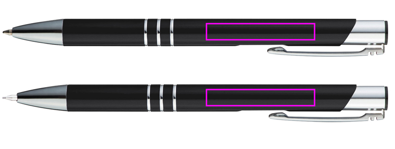 Skrivset av aluminium, bestående av en kulspetspenna med blå skrivpåfyllning med stor kapacitet och en mekanisk penna, var och en med dekorativa ringar. Din logotyp kommer att graveras till höger om klippet.