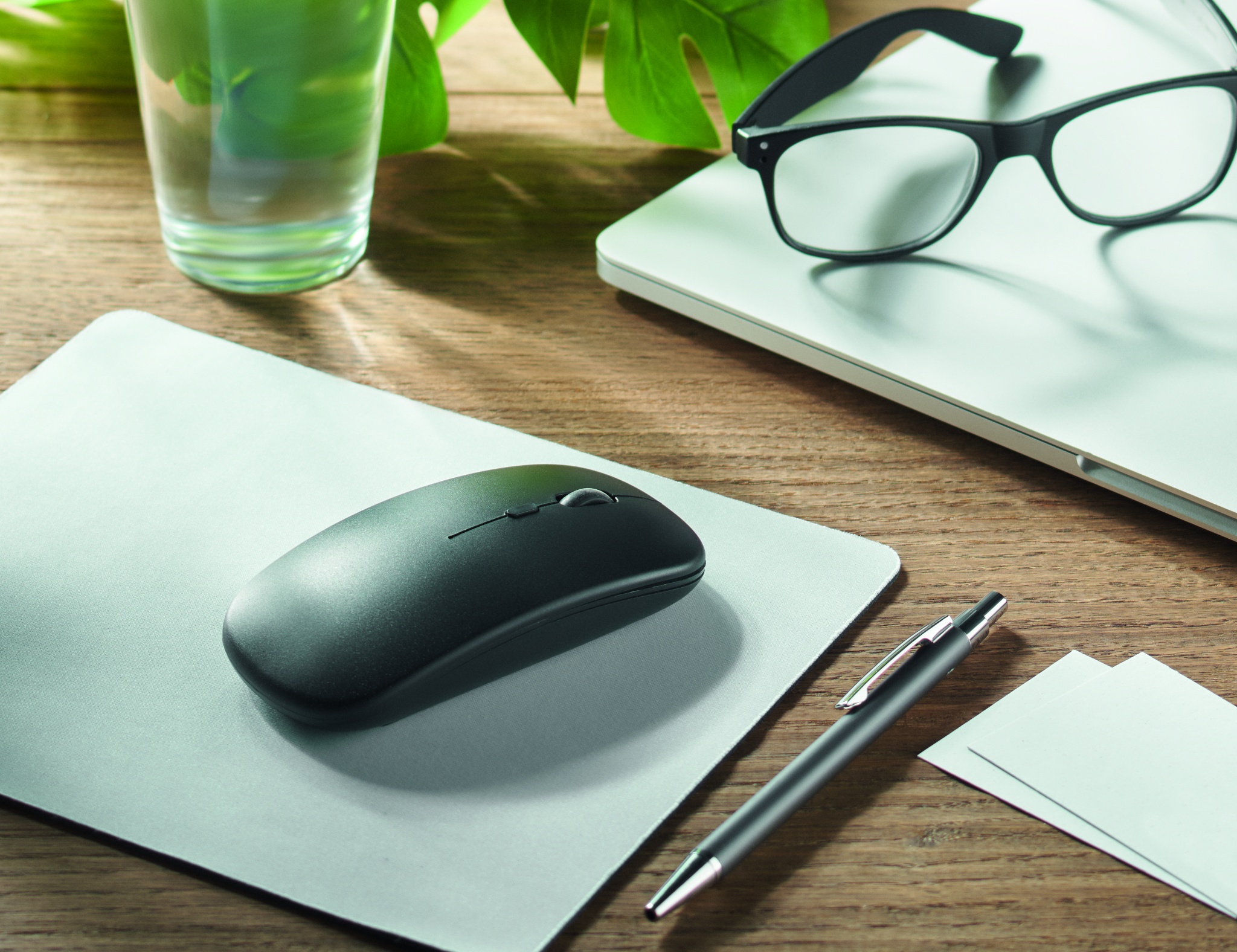 Optisk trådlös mus i återvunnen ABS med uppladdningsbart 500 mAh batteri.