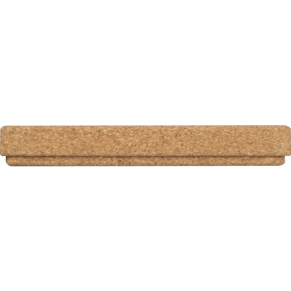 Högkvalitativ vridverkande kulspetspenna i metall med korkbeläggning, blåskrivande refill i ett fodral som också är tillverkat av kork. Din logotyp kommer att graveras bredvid klippet.